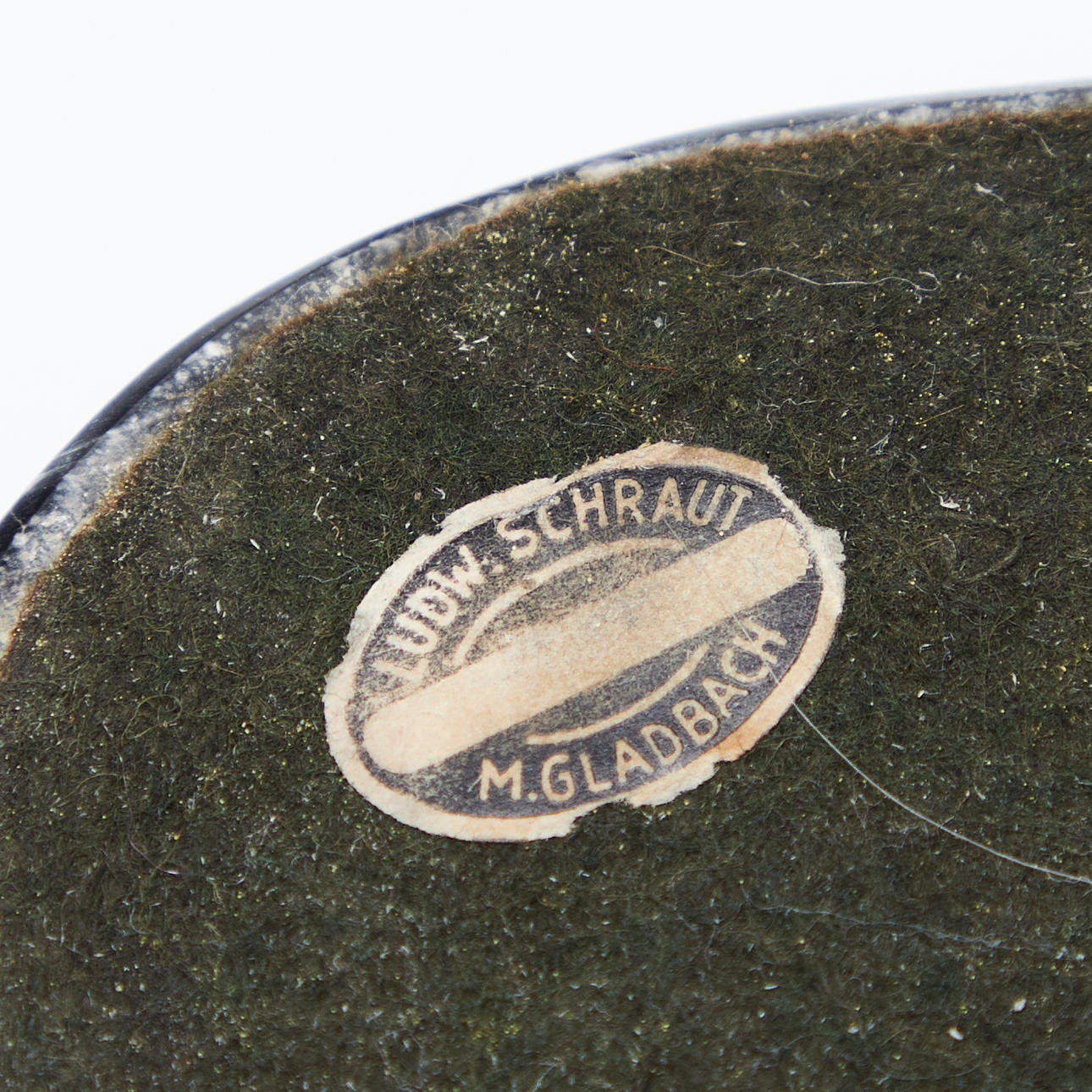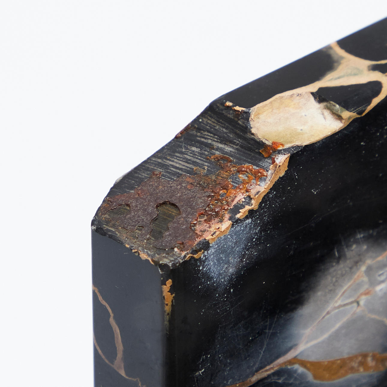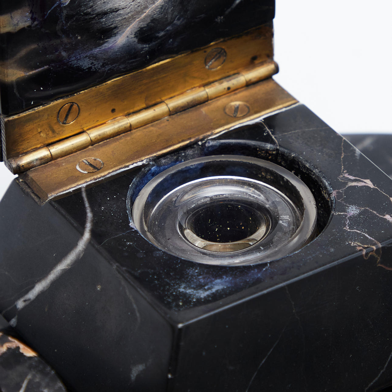 Altersgemäße Gebrauchs- und Reibespuren, partielle Verfärbung im Marmor des montierten Behältnisses, Bruchstelle am Deckel eines Tintenfasses, teilweise fehlende Filzgleiter bzw. Filzreste.
