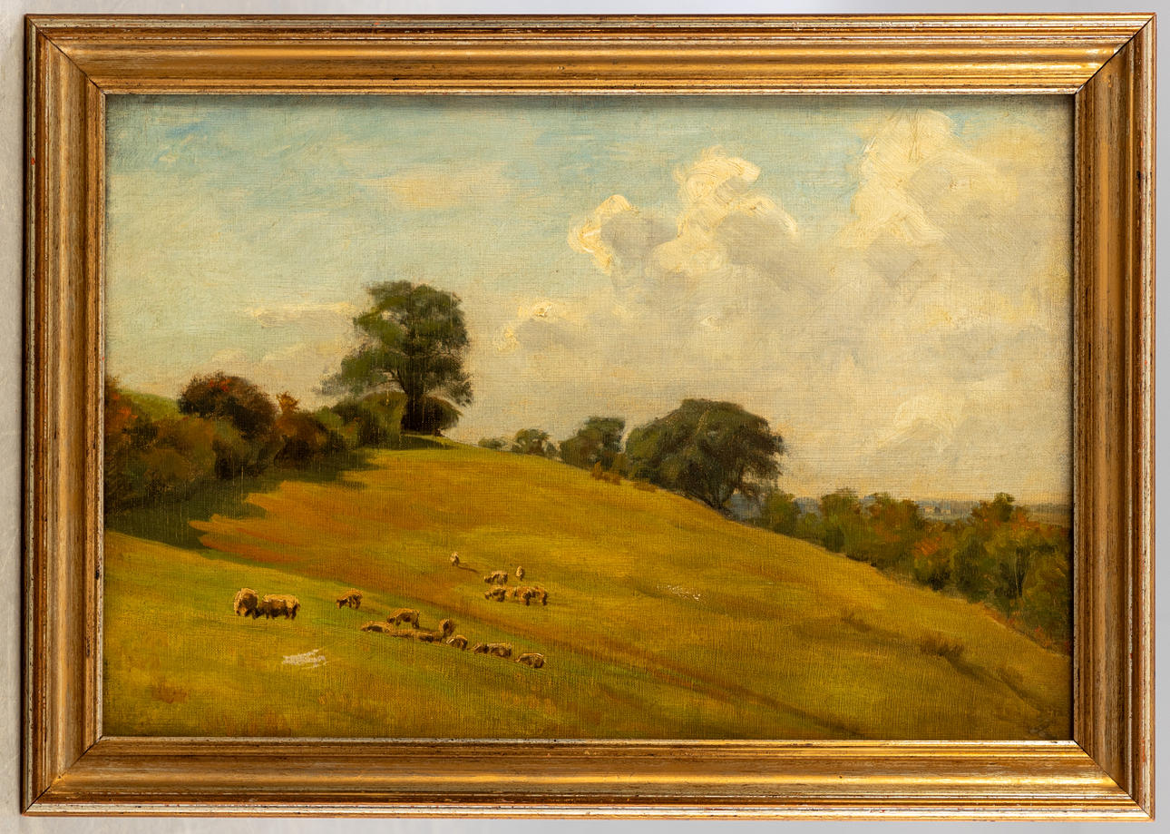 Englischer Landschaftsmaler, Landschaft mit Schafen, Öl auf Leinwand, um 1900, ca. 38 x 57 cm, mit Rahmen ca. 45 x 65 cm.