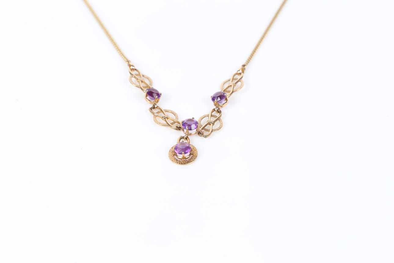 3485919. SCHMUCKSET AUS 9-KARÄTIGEM GOLD MIT AMETHYST.