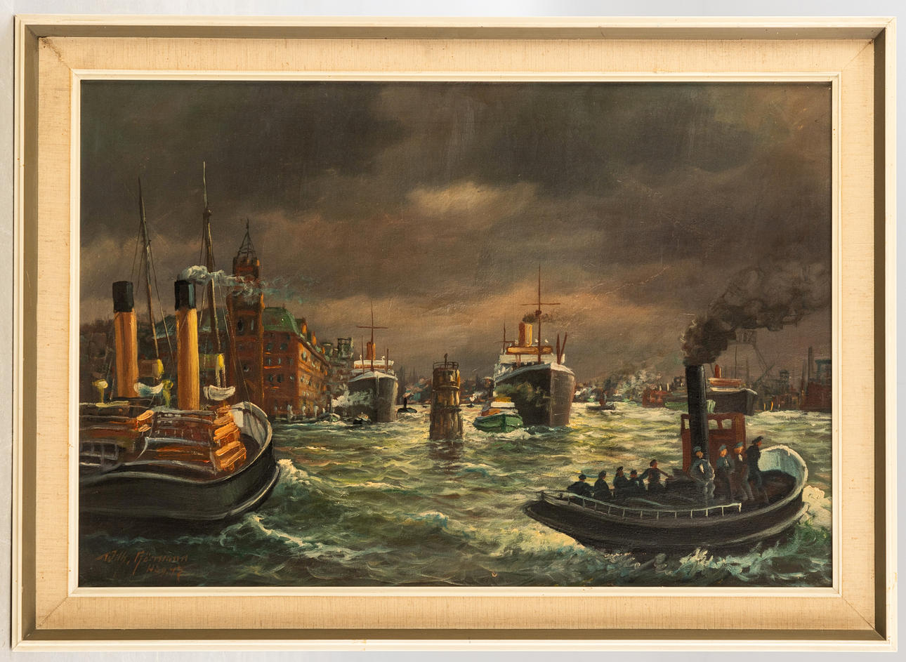 Wilhelm Hörmann (geb. 1916), Hamburger Hafen, Öl auf Leinwand, 1947, signiert, datiert und bezeichnet 'Hbg.', ca. 55 x 81 cm, mit Rahmen ca. 67 x 92 cm.