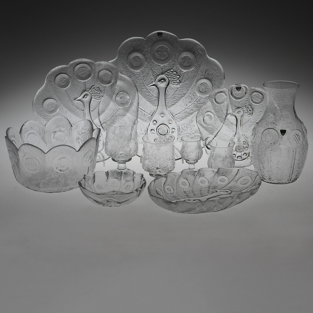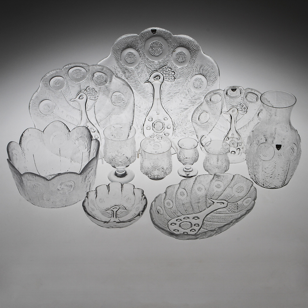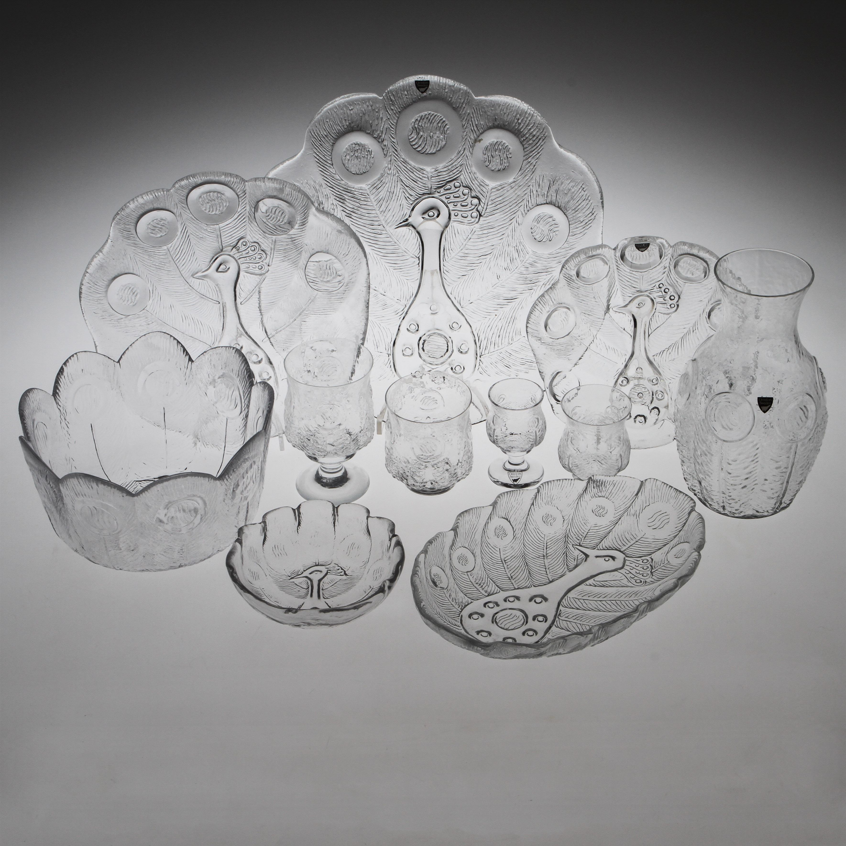 350794. SERVICE, 54 Teile, "Påfågel", Orrefors.