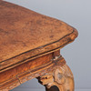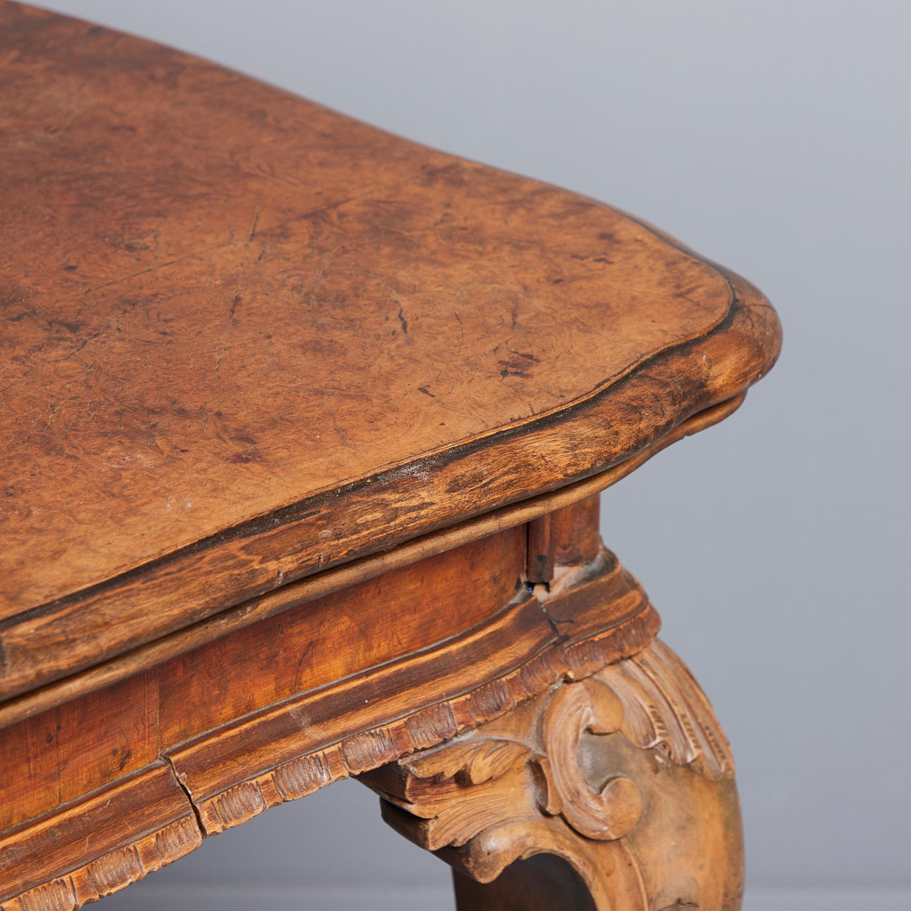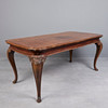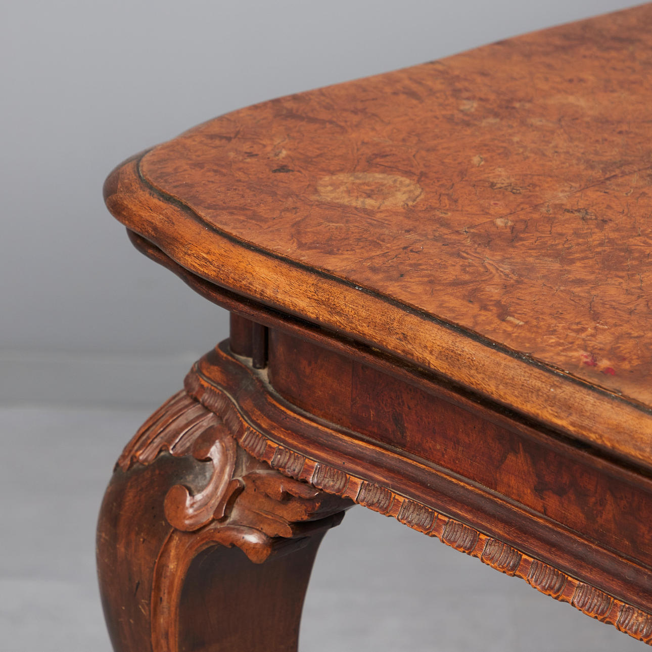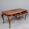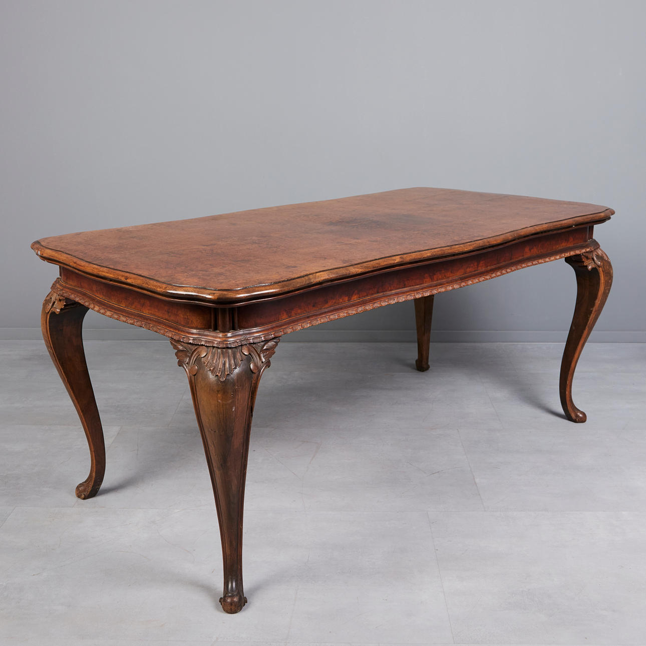 Konstruktion aus lasiertem Mahagoniholz mit vier geschwungenen Beinen und einer organisch geformten Tischplatte aus Wurzelholzfurnier, seitlich mit zwei Schüben, H.79cm, L.189cm, B.96cm.