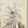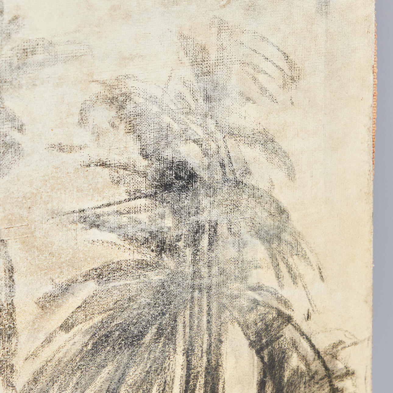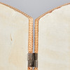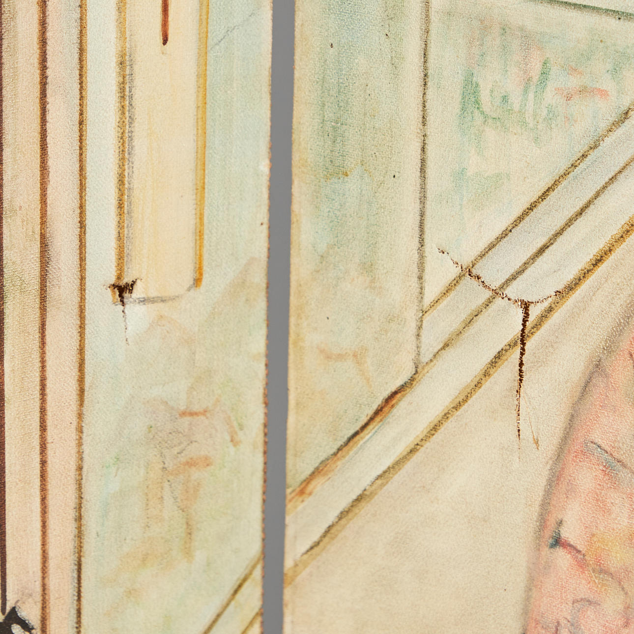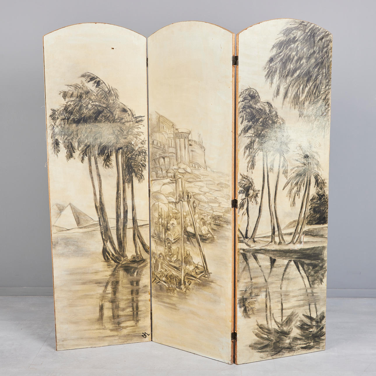 Paravent bestehend aus drei klappbaren Teilen, oberseitig abgerundet mit Fronten aus handgemalter Leinwand, einseitig in schwarz gefasst mit Pyramidendarstellungen, auf der anderen Seite polychrom bemalt mit Personen in traditionell japanischer Kleidung, H.168cm, L.150cm, B.2cm.