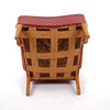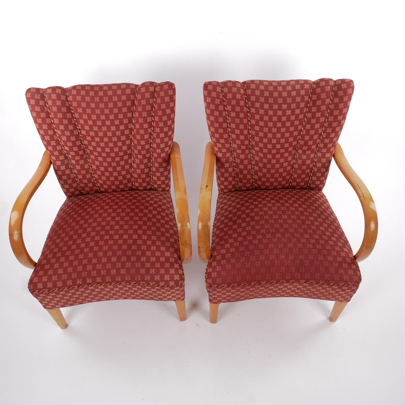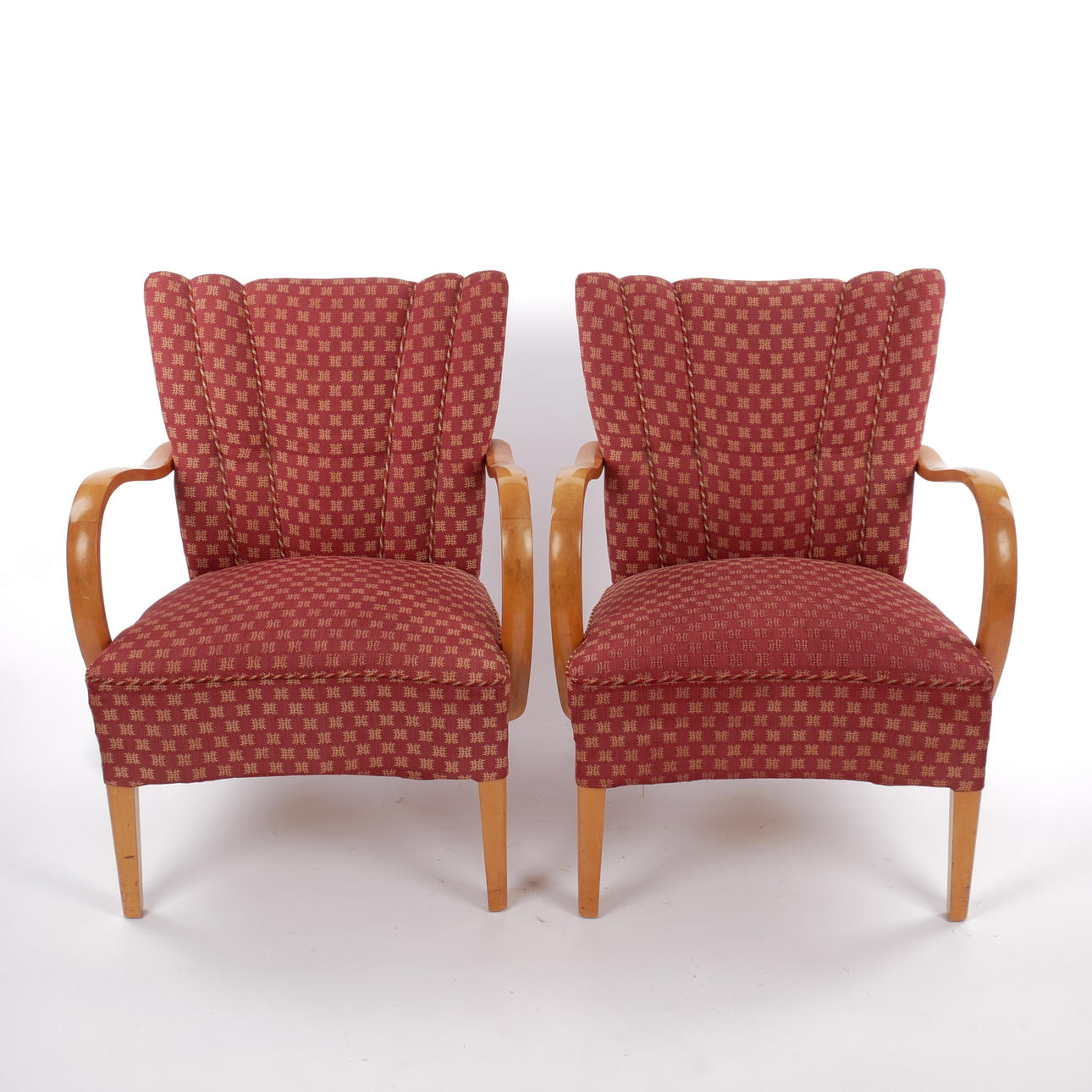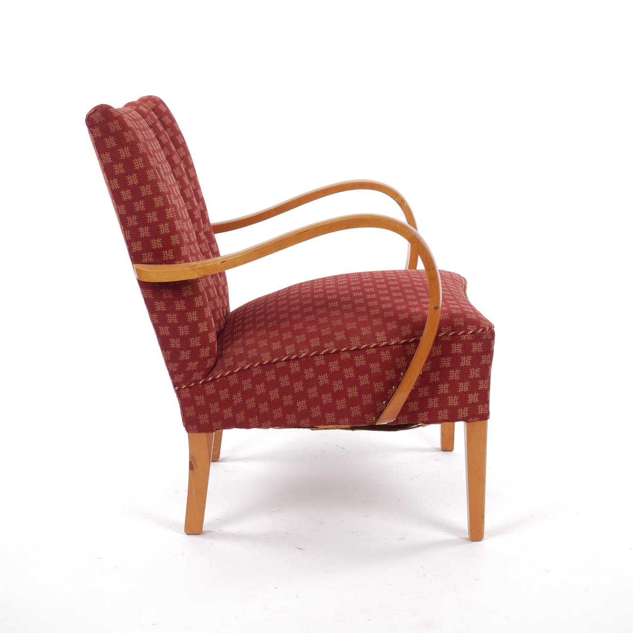 Rahmen aus honiggelber Birke. Gepolsterter Sitz und Rückenlehne mit gemusterter Originalpolsterung. Breite 64 cm, Tiefe ca. 64 cm, Sitzhöhe ca. 42 cm, Rückenhöhe 79 cm.