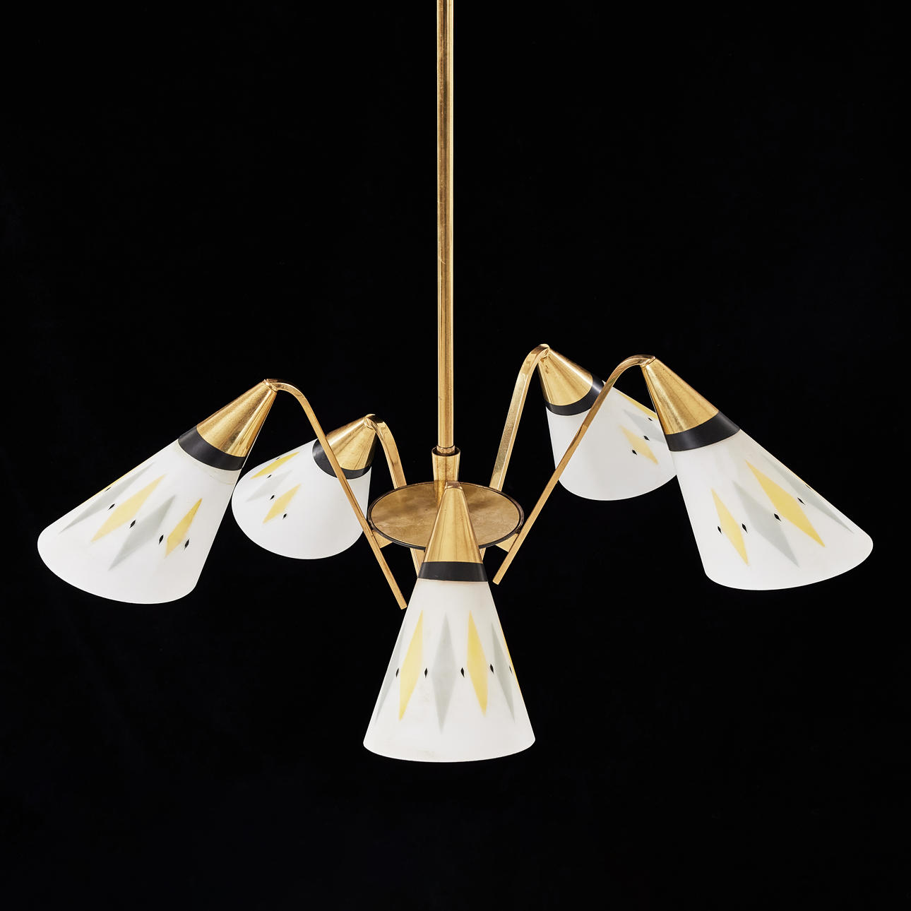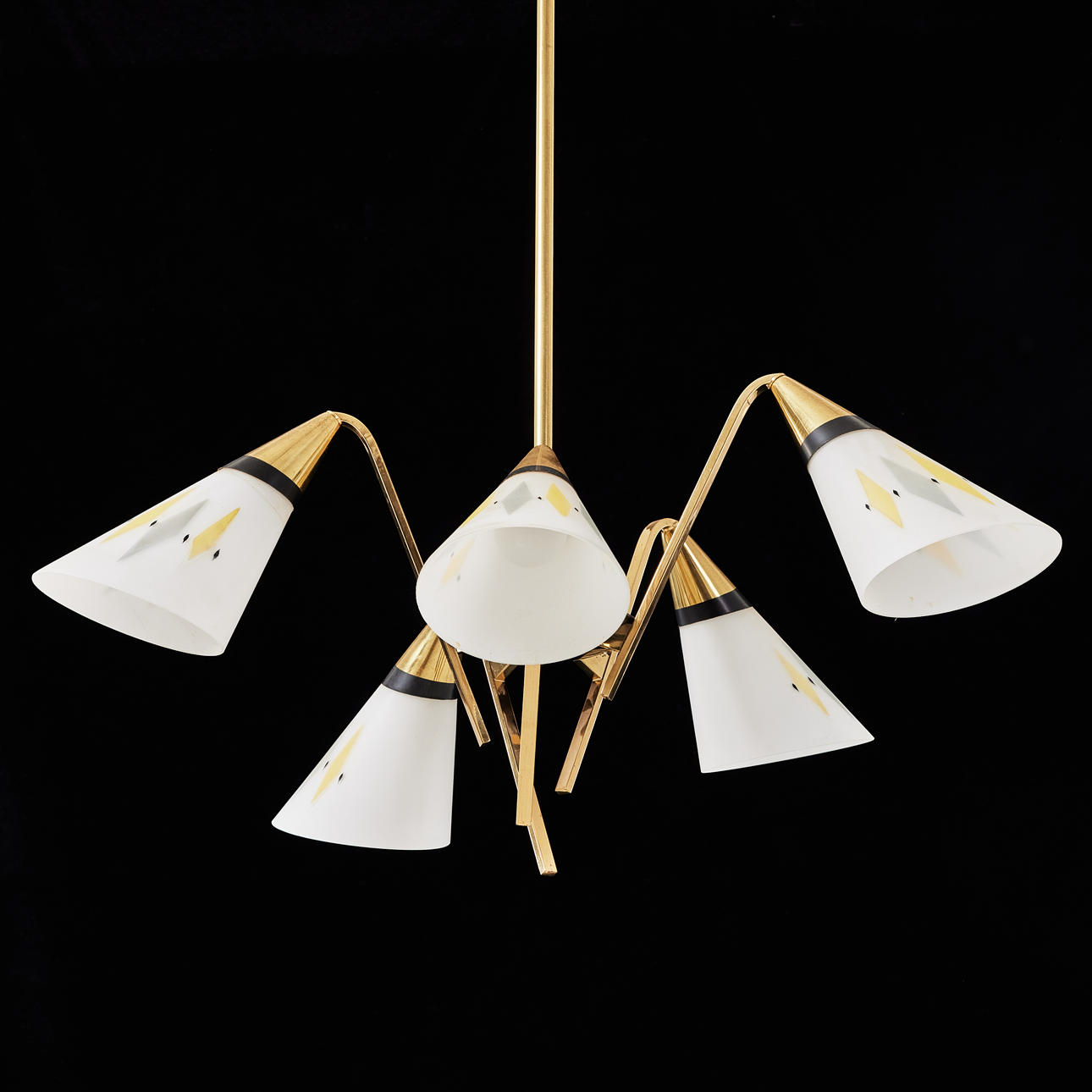 3520833. DECKENLAMPE, 1950/60er Jahre, Messing, Opalglas mit Muster.