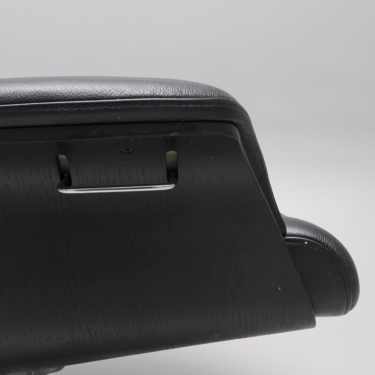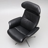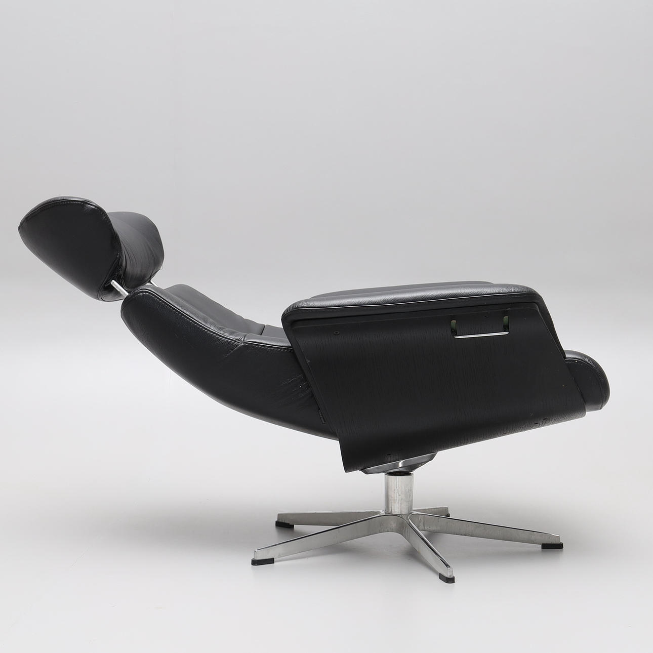 Sessel mit verchromtem Drehfuß, verstellbarer Rückenlehne, gebogenem Holzgestell, Lederpolsterung. Beschriftet.