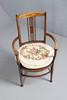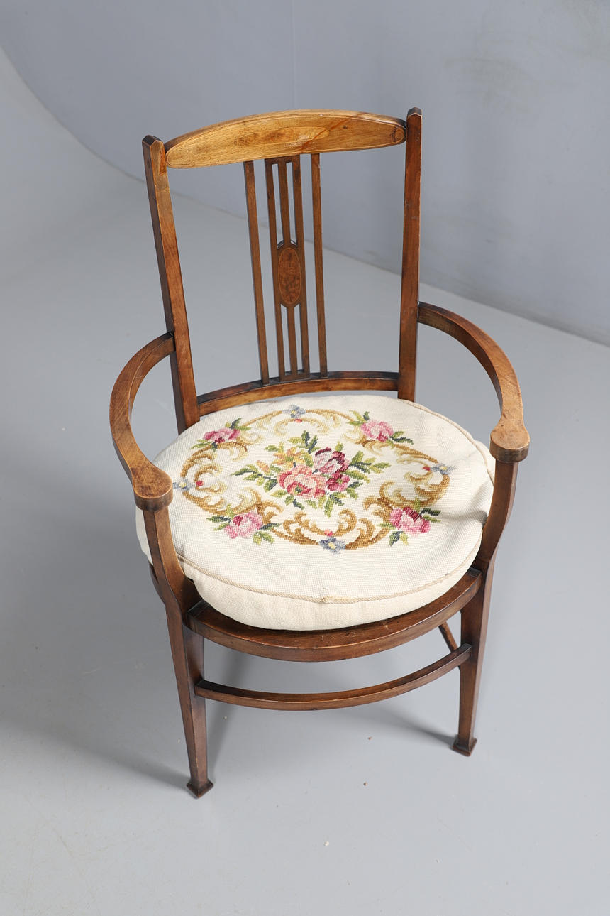 3525367. EIN HÖHENVERSTELLBARER, EBONISIERTER KLAVIERHOCKER IM VIKTORIANISCHEN STIL, EIN EDWARDIANISCHER SESSEL AUS MAHAGONI MIT INTARSIEN UND EIN RUNDER BEISTELLTISCH AUS DEM 20. JAHRHUNDERT.