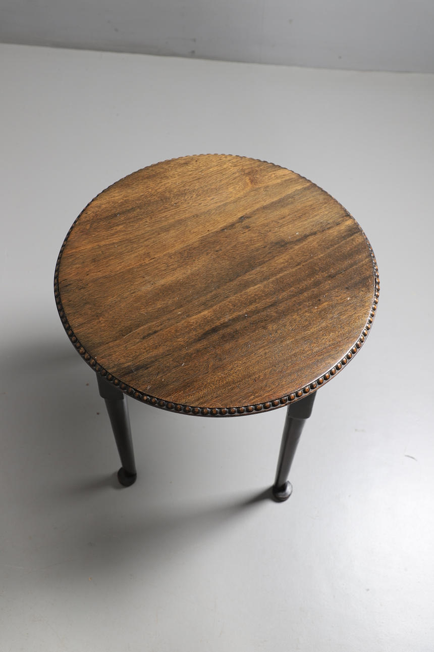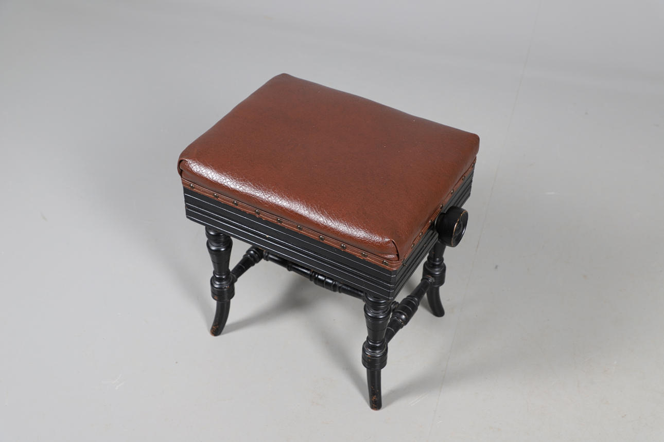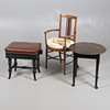 EIN HÖHENVERSTELLBARER, EBONISIERTER KLAVIERHOCKER IM VIKTORIANISCHEN STIL, EIN EDWARDIANISCHER SESSEL AUS MAHAGONI MIT INTARSIEN UND EIN RUNDER BEISTELLTISCH AUS DEM 20. JAHRHUNDERT.