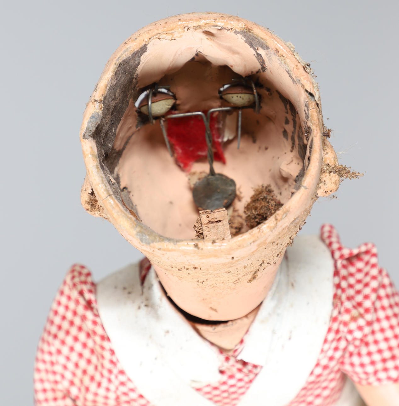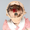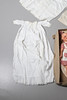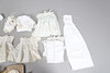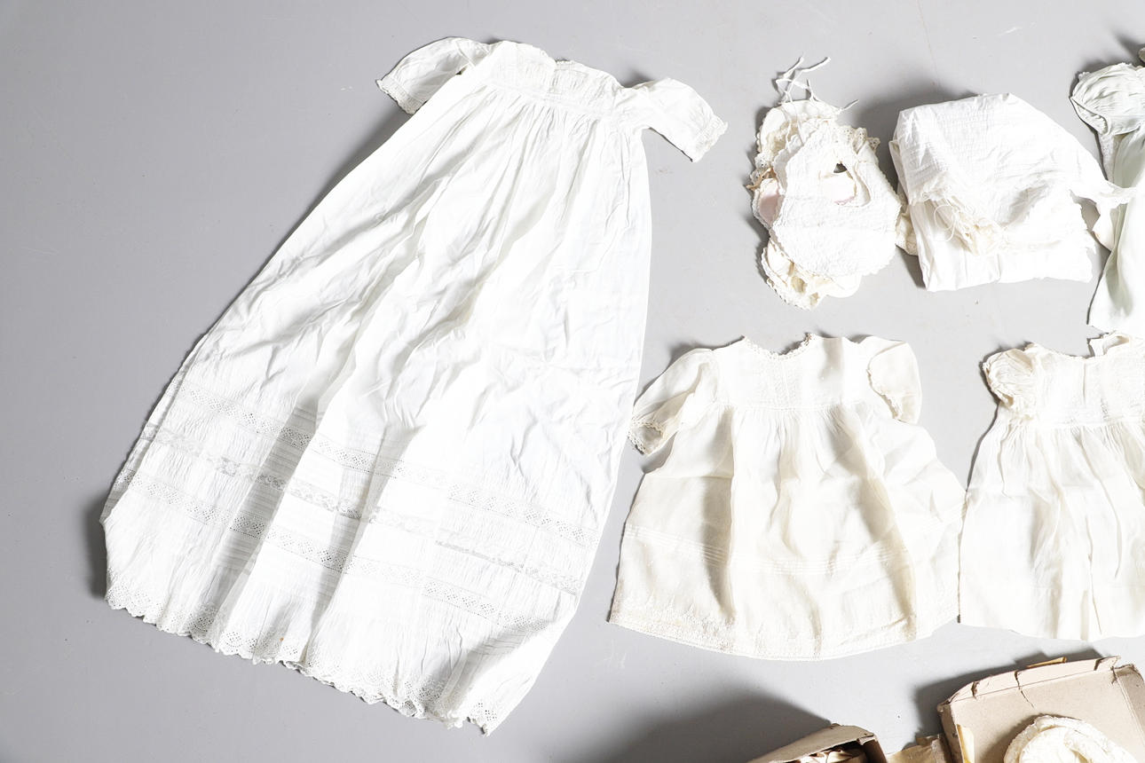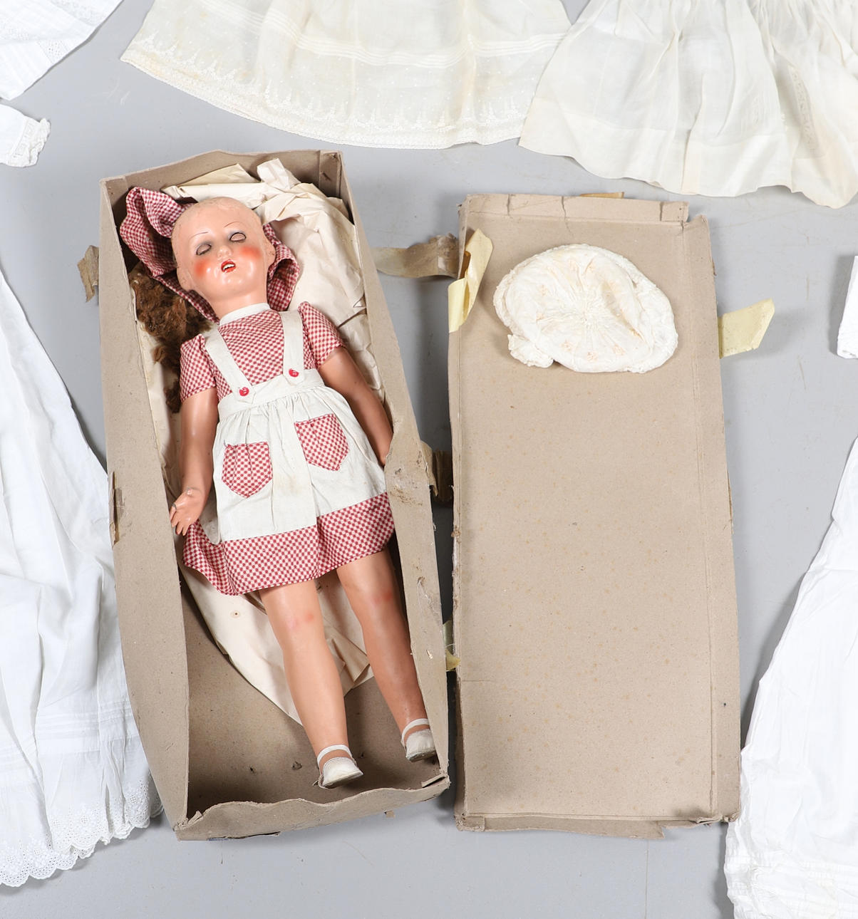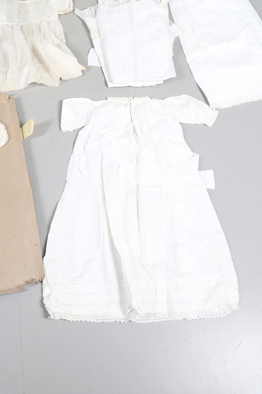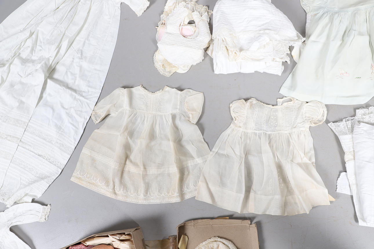 Eine Box mit einer Vielzahl von Vintage-Kinderkleidung, darunter Kittelkleider, Unterröcke, Lätzchen und andere Artikel. Auch mit einer Kopfpuppe aus Vintage-Komposition (59 cm hoch).
