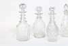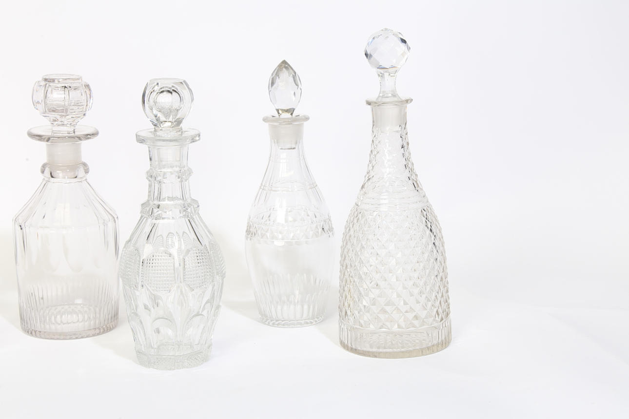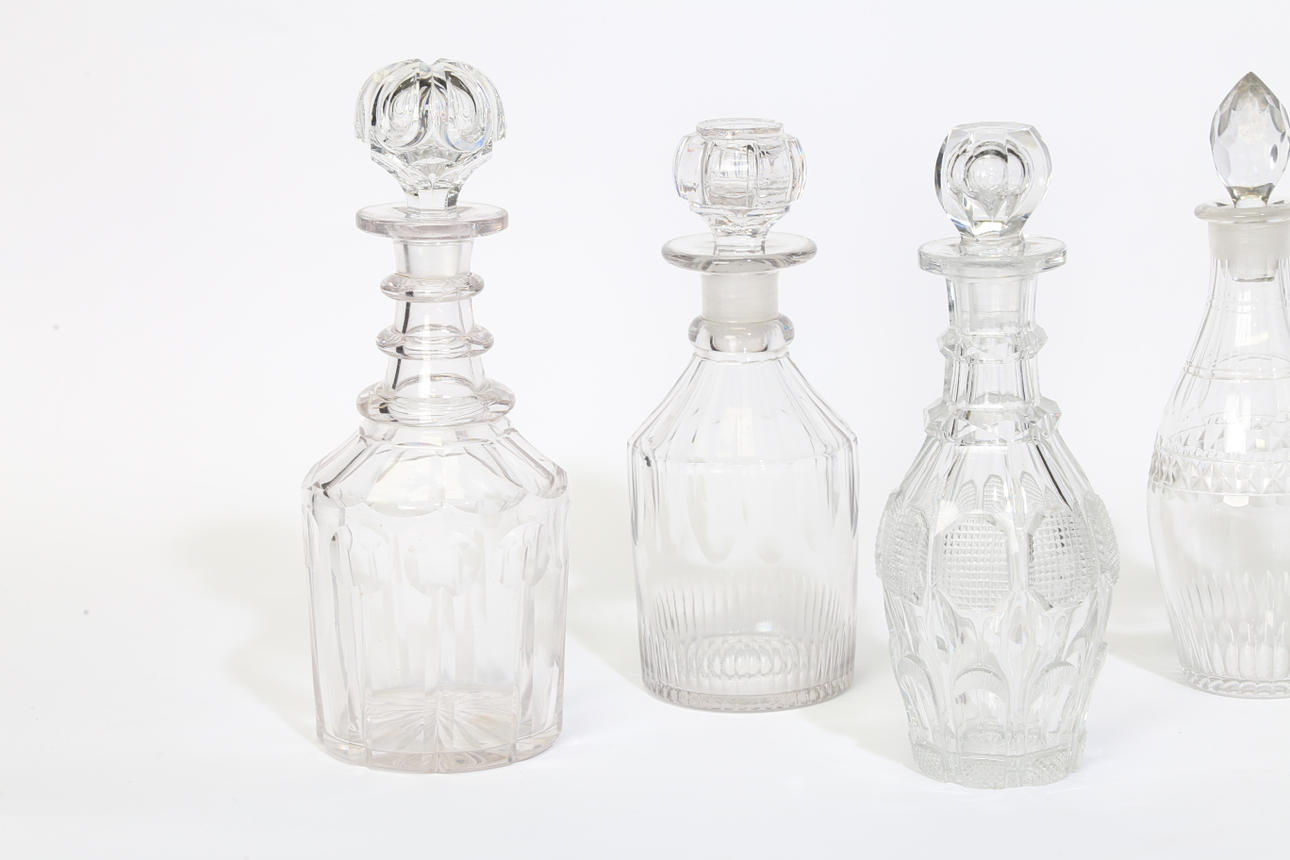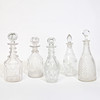Fünf Karaffen aus geschliffenem Glas aus dem 19. Jahrhundert, die höchste ist.