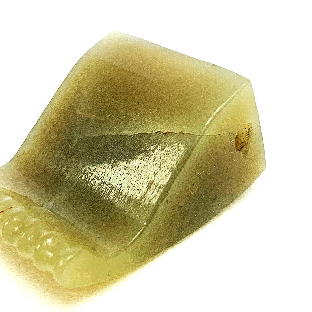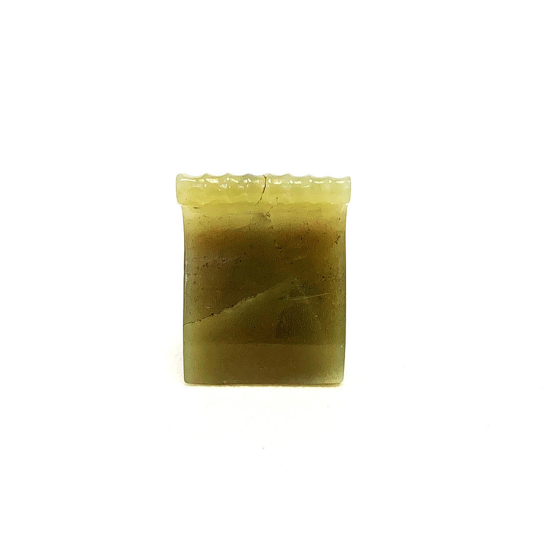 Ein chinesischer geschnitzter olivgrüner Jadeit-Jadeit-Haarschmuck, H. 4 cm. B. 3 cm.