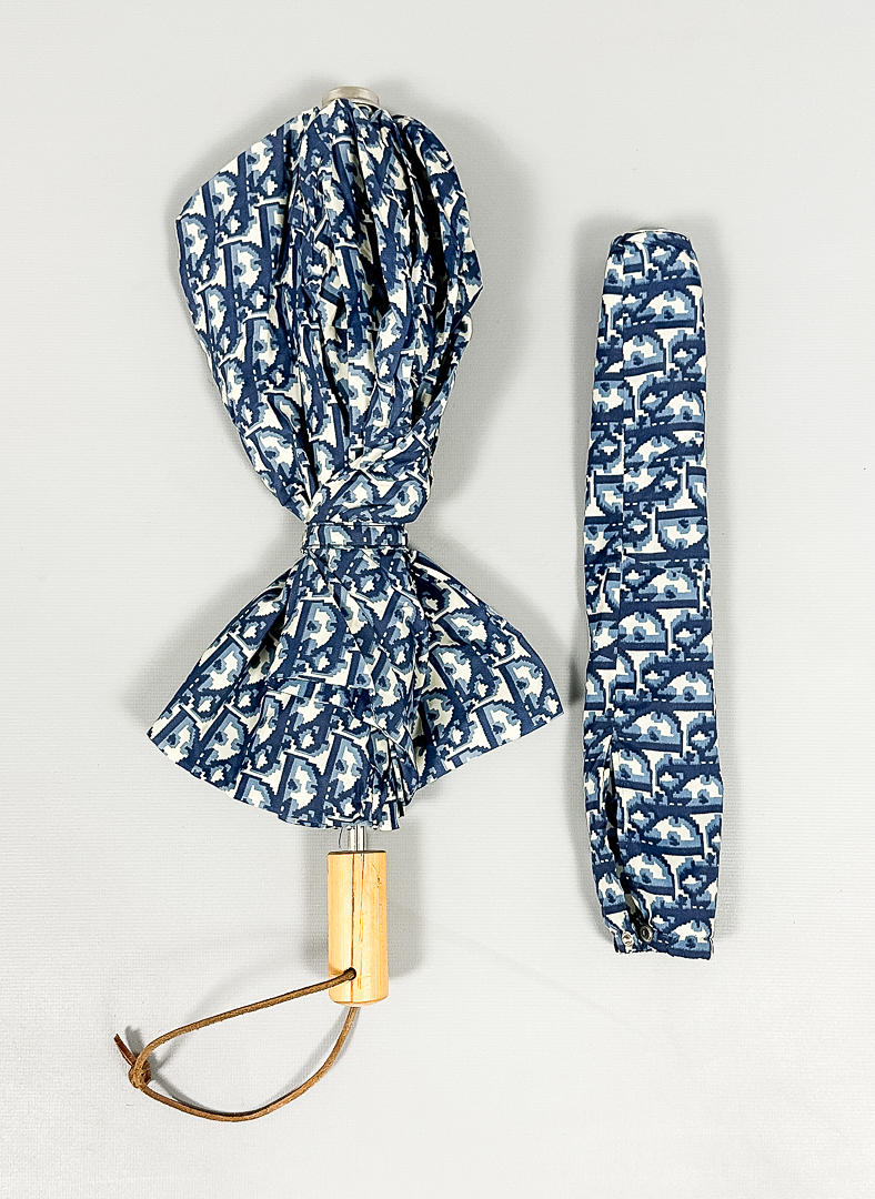 Gemusterter Stoff von Dior in Blau. Holzgriff, Länge ca. 42 cm Koffer im Lieferumfang enthalten.