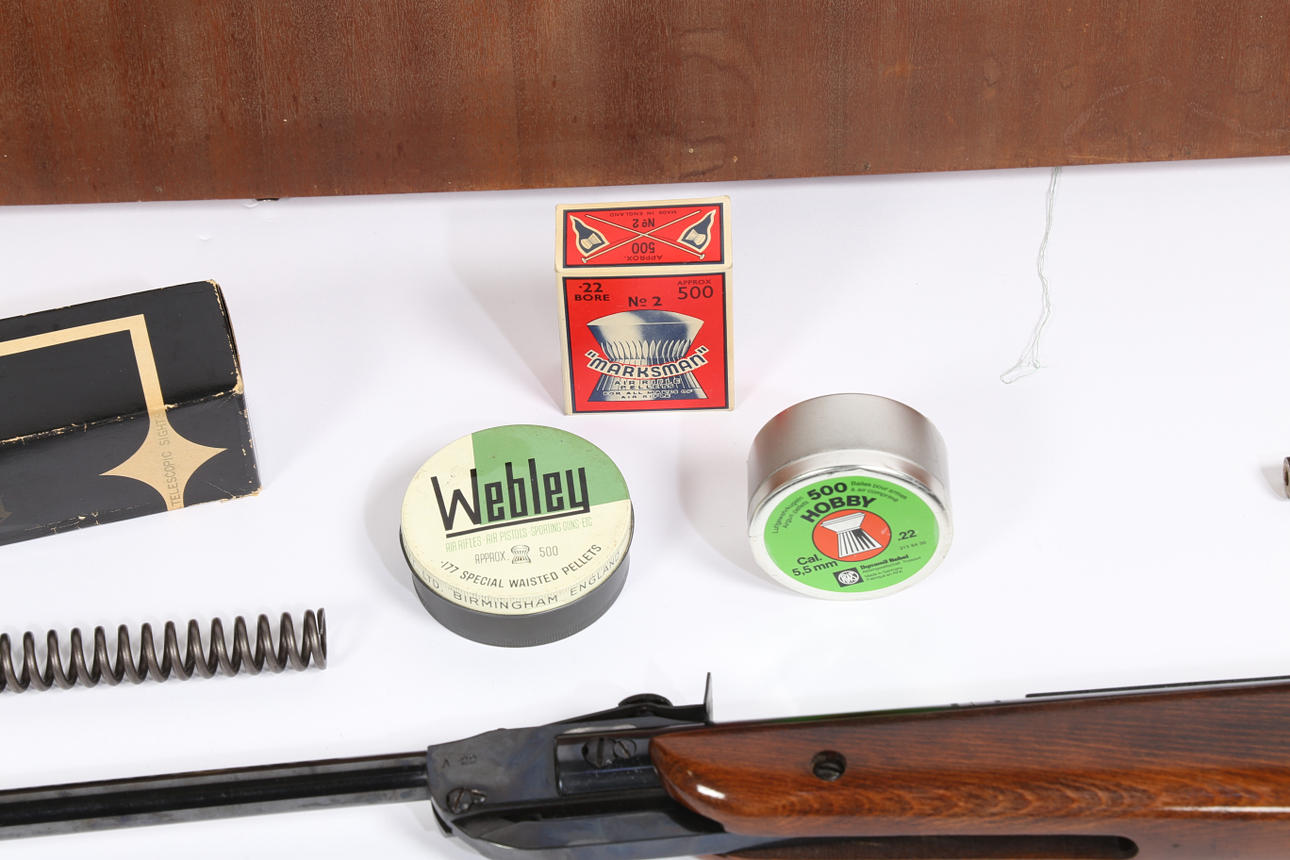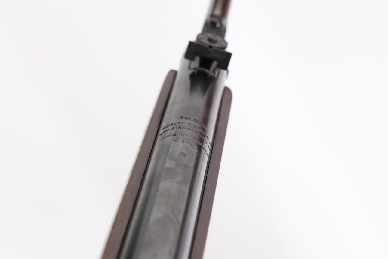 Webley & Scott Falcon .22 Luftgewehr, ca. 1970er Jahre, Bremsrohr, verstellbares Rückvisier, polierter Halbstock aus Holz, zusammen mit einem Nikko Sterling-Teleskopvisier, in einem Holzetui mit Ersatzfeder.