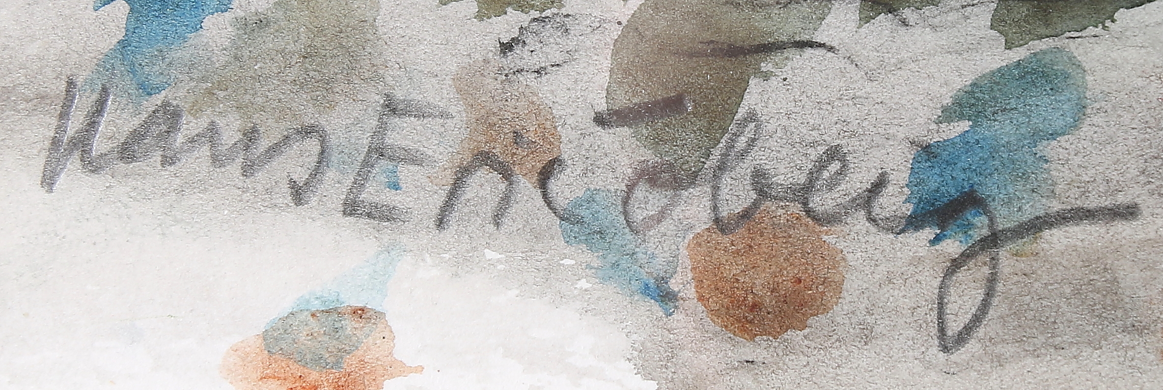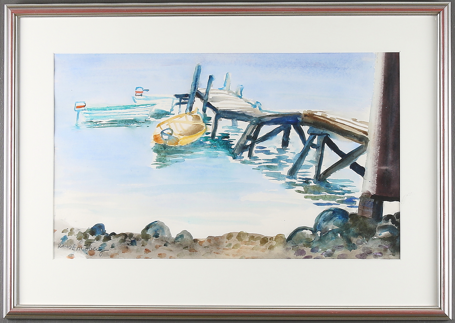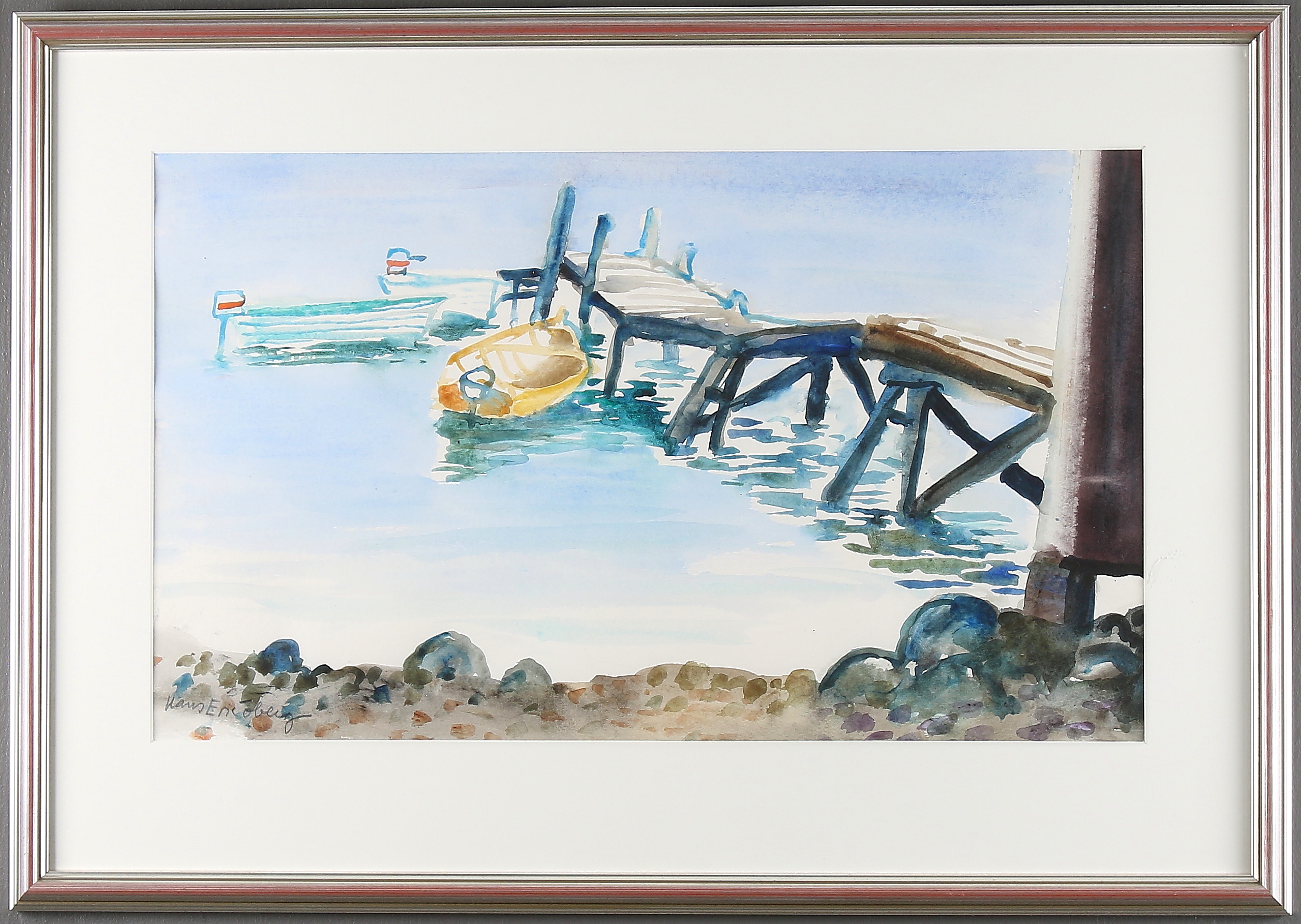 354066. HANS ERIK ÖBERG. Pier mit Booten, Aquarell, signiert.