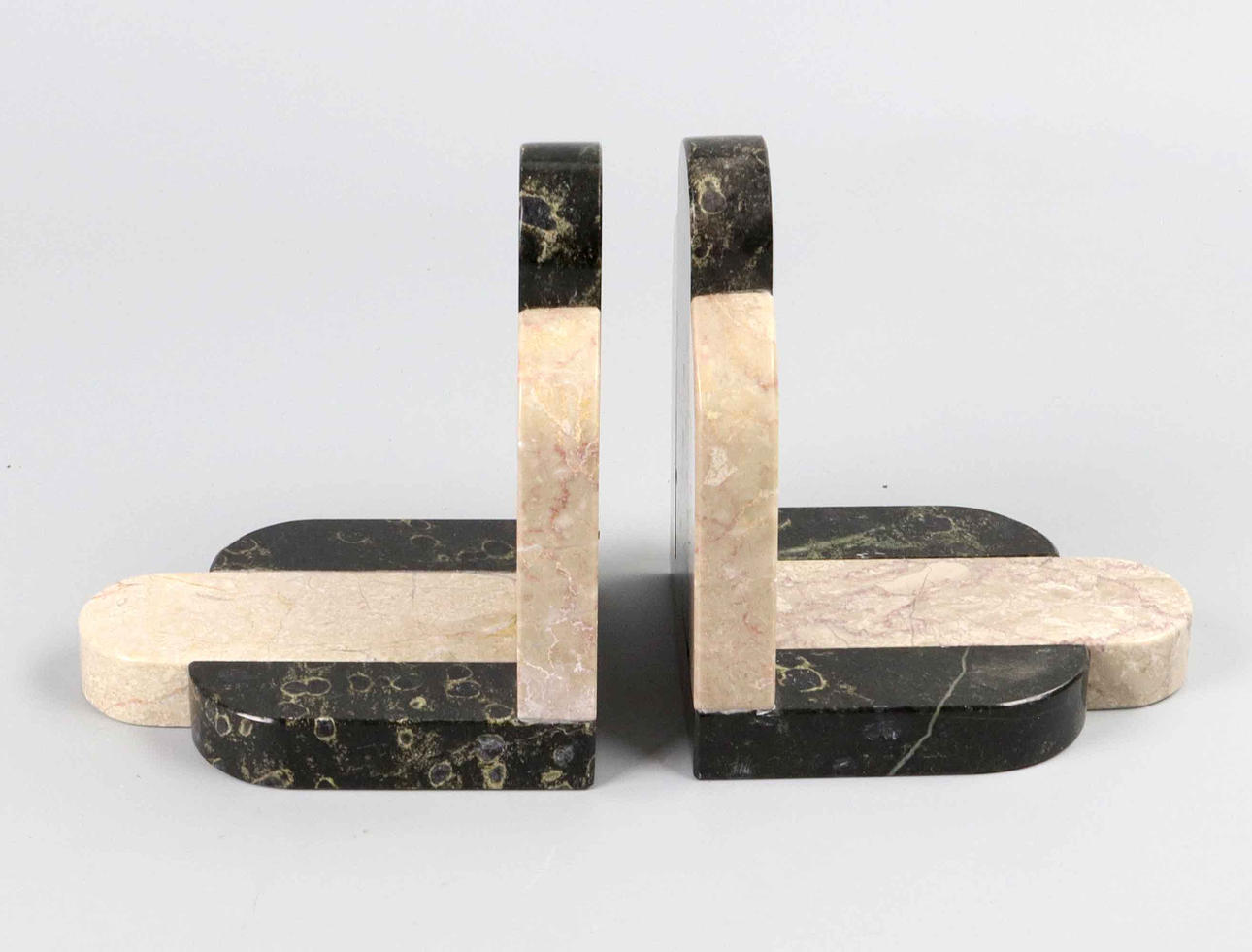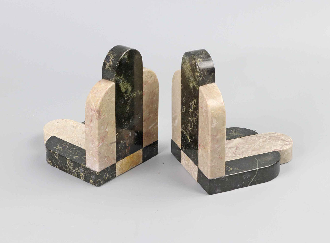 Bauhaus Buchstützen, aus Serpentin und Marmor gearbeitet, aus der Zeit um 1925-1935, Höhe ca. 14 cm, Breite ca. 10 cm.
