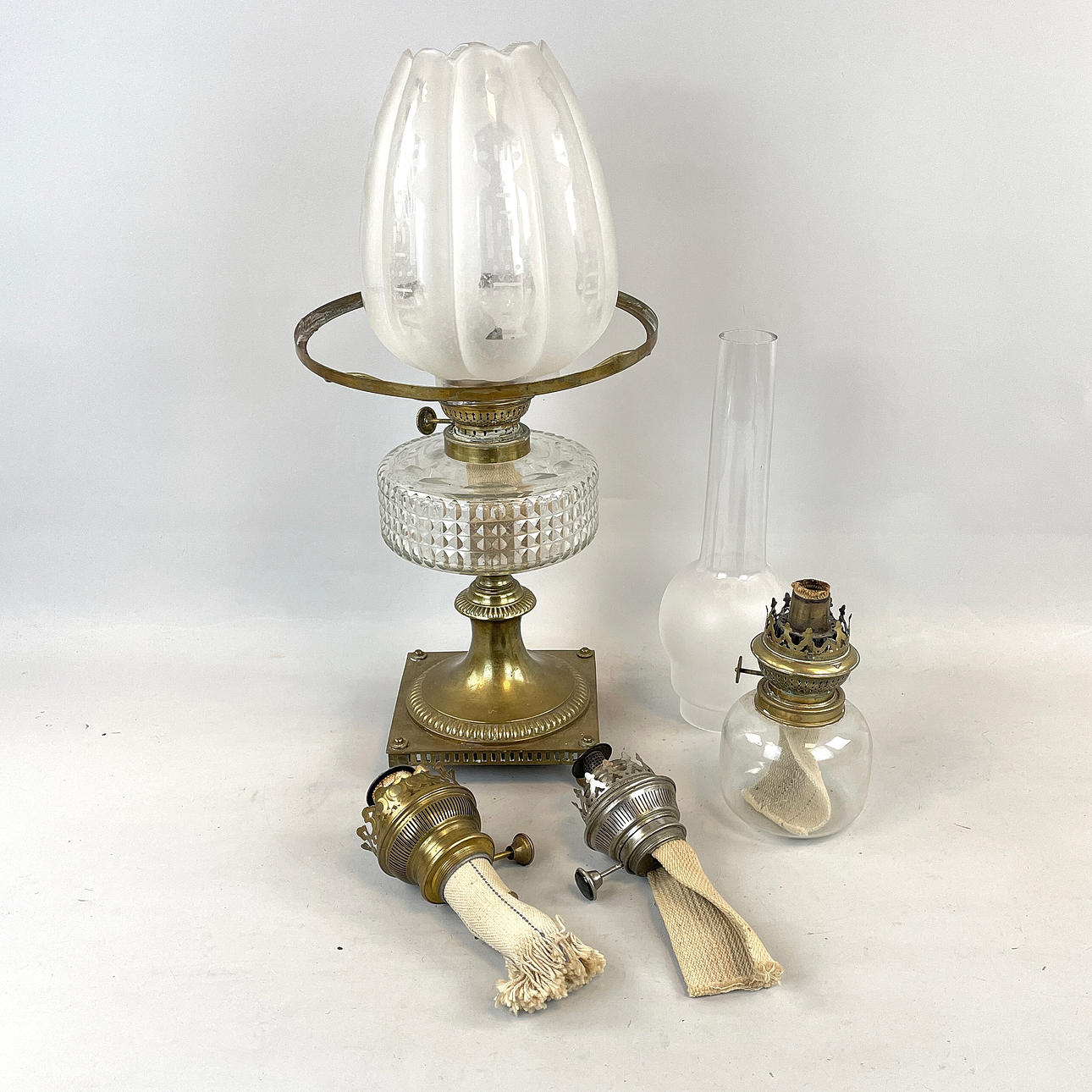 PETROLEUMLAMPE und ERSATZTEILE, 7 Stück.