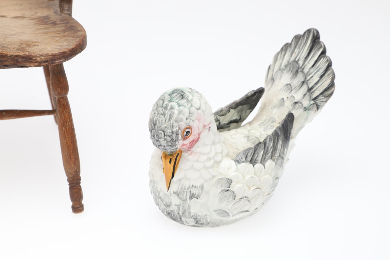 Eiche mit gekämmter Rückseite. Zusammen mit zwei Vogelfiguren aus Keramik (3).