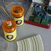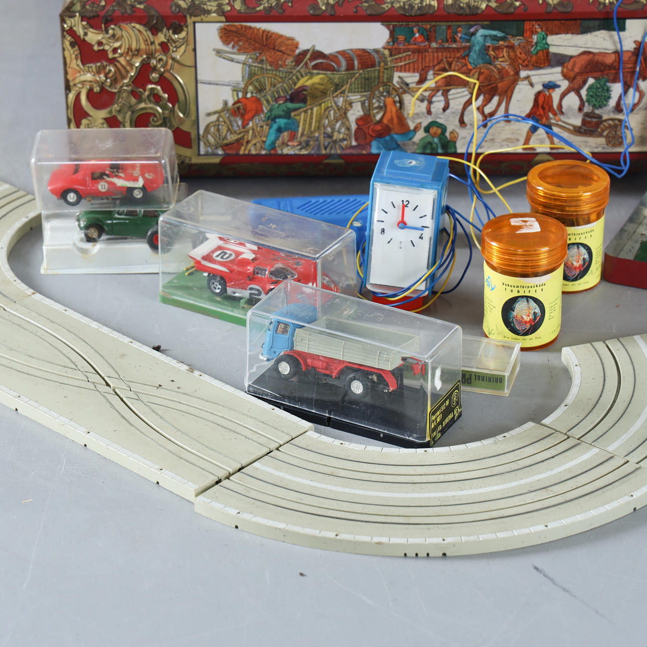 Schienenteile für Autos, Schienen, Autos usw. Im Lieferumfang ist eine Blechdose enthalten.