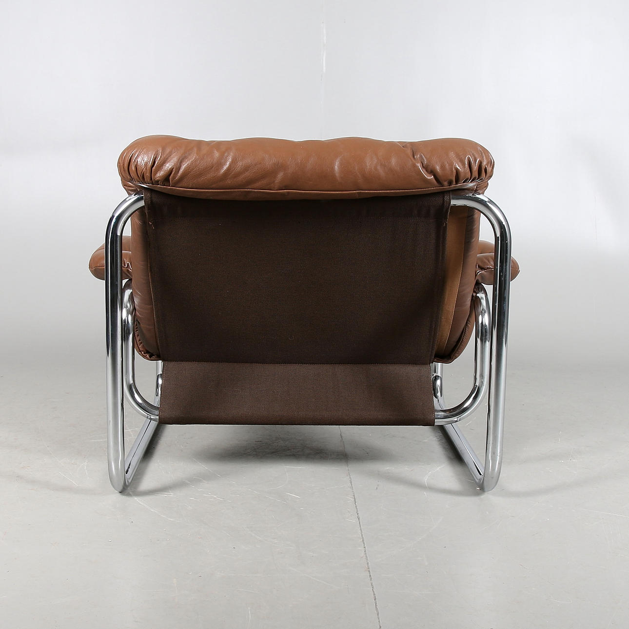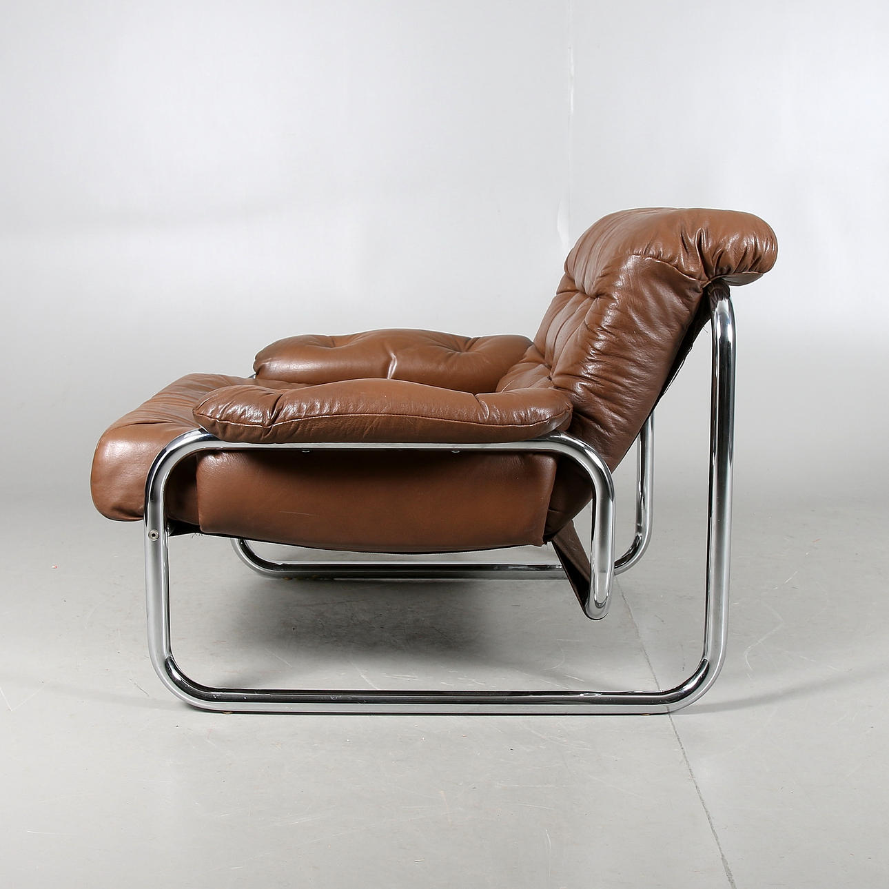 Rohrkörper verchromt. Polsterung aus braunem Leder. Länge 92, Breite 90, Höhe 70 cm.