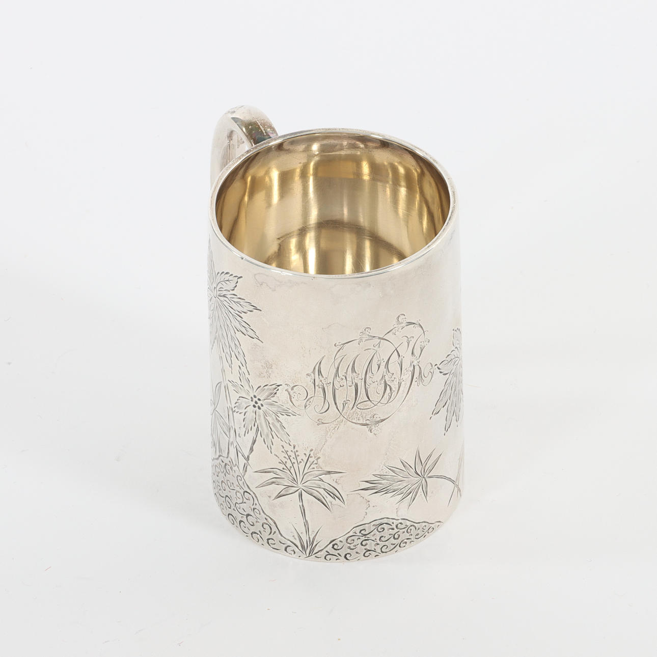 Silberner Becher mit Henkel, Ziselinge mit Kokospalmen, Monogrammplakette, Unterseite gestempelt N.B. im Jahr 1895.