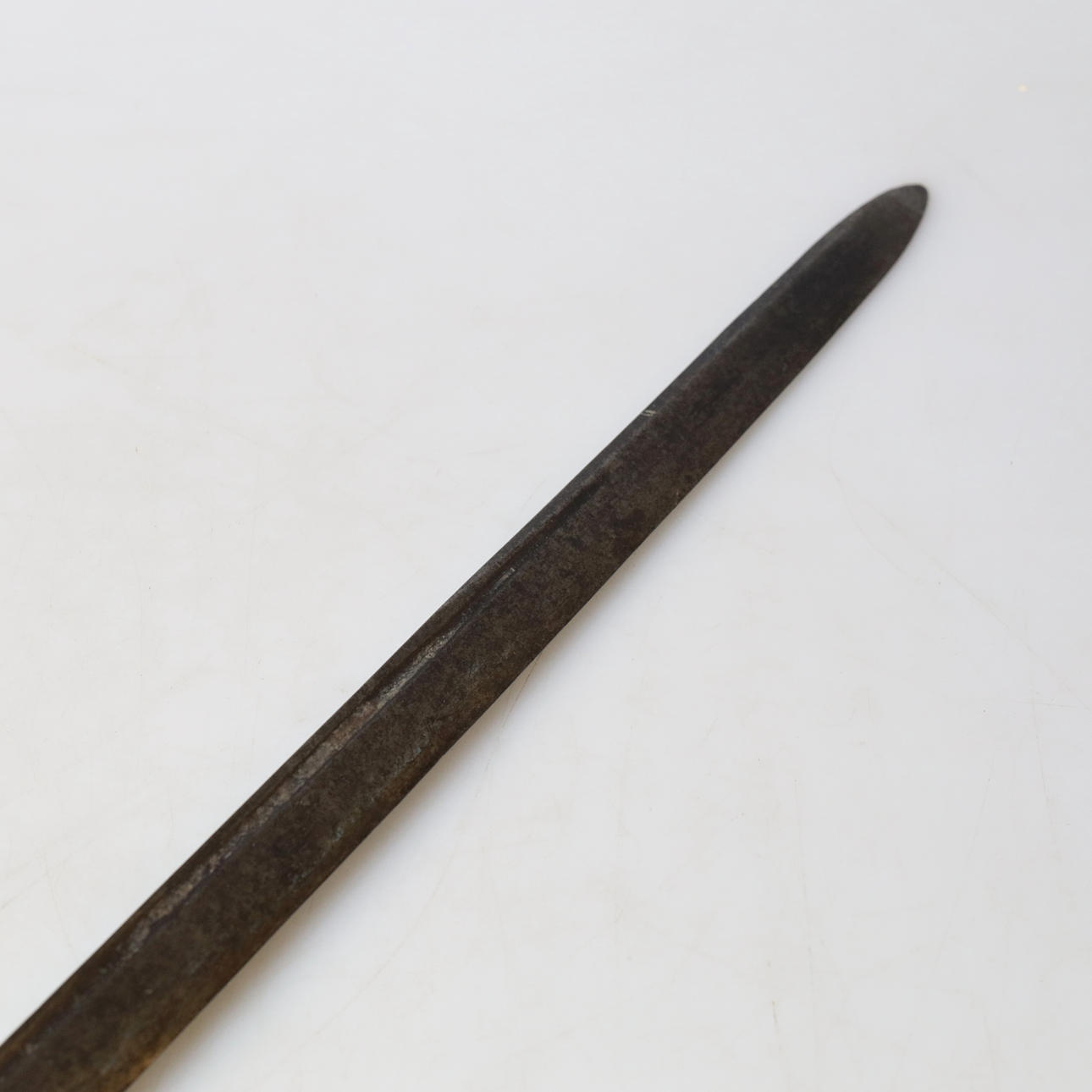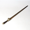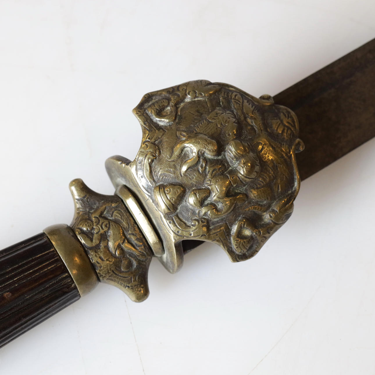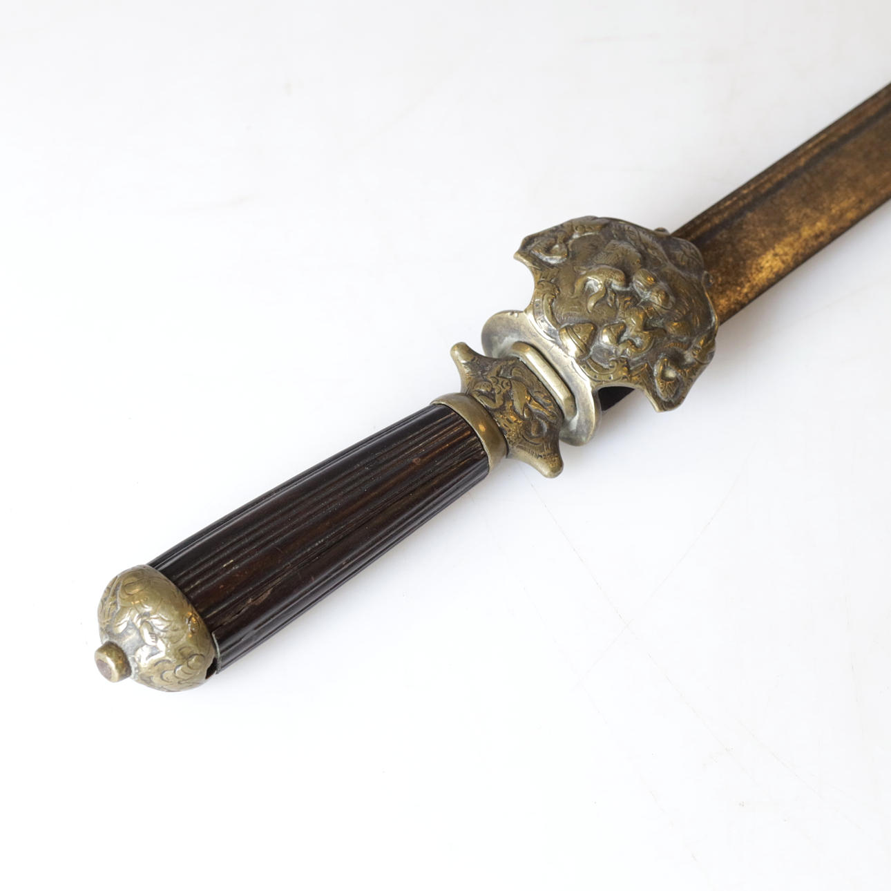 Messingknopf, Verbindungsstange und Stecker. Griff aus Holz. Klinge aus Eisen. Hjalt mit Reliefdekor.