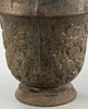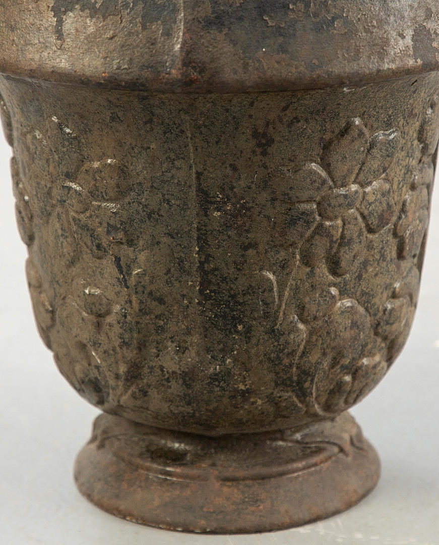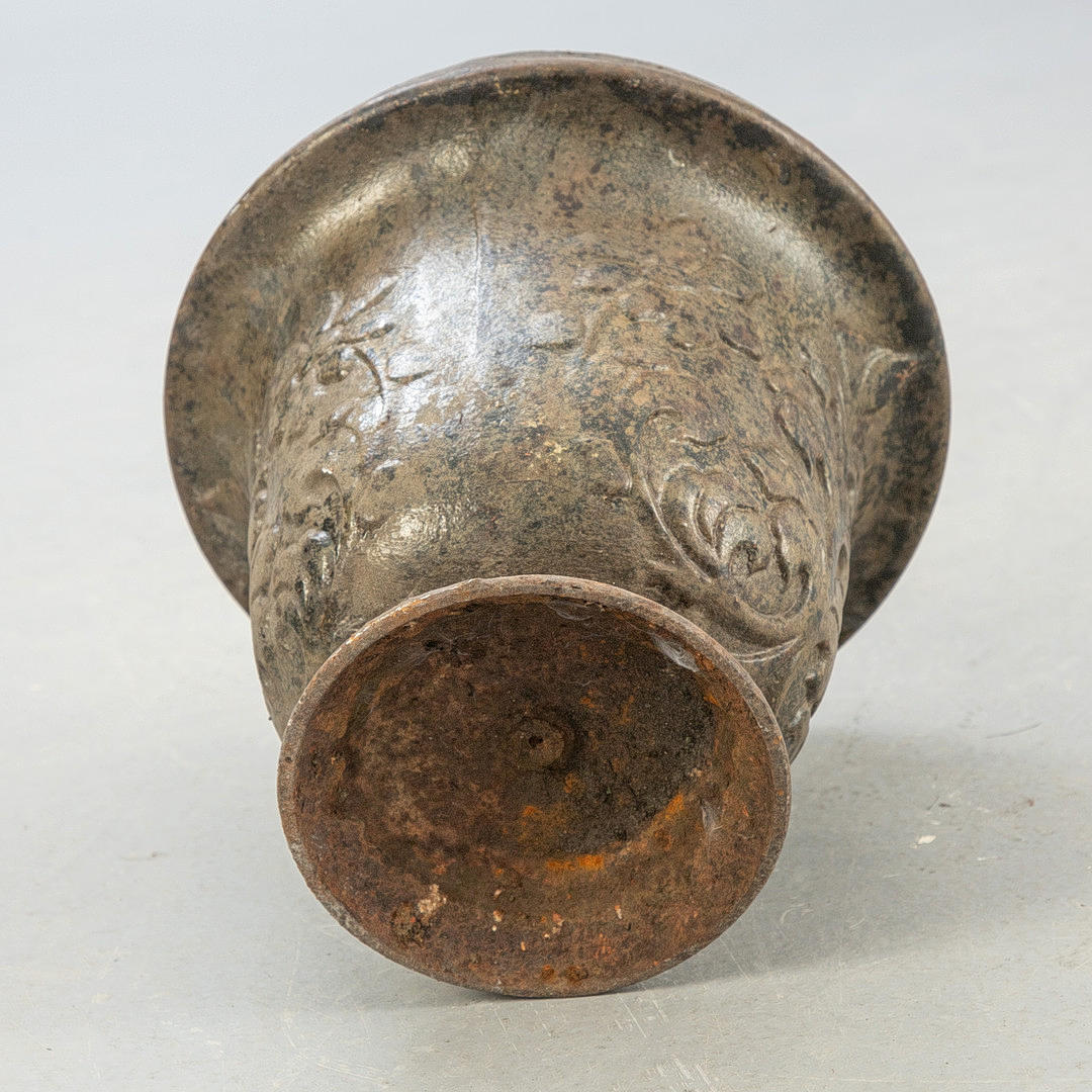 Eisenguss. Auf rundem Standfuß konischer Korpus mit breitem Rand. Reliefblattwerk und -Blumen. HxDm. ca. 31 x 30 cm.