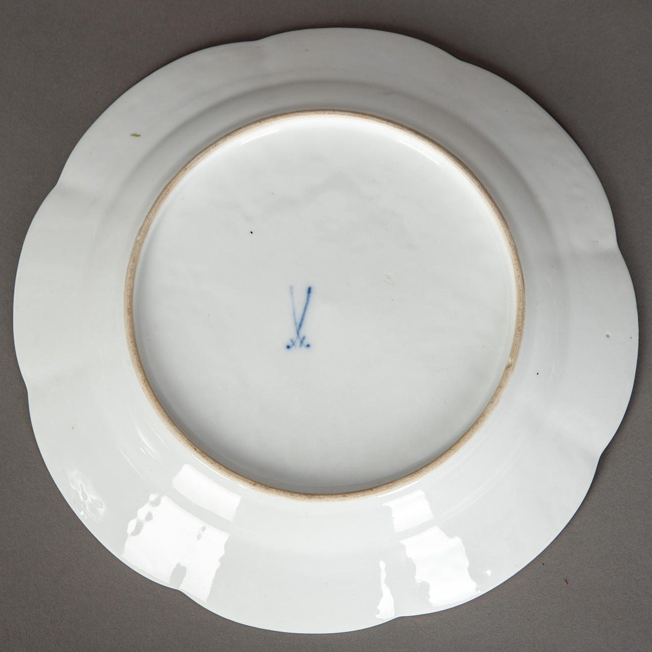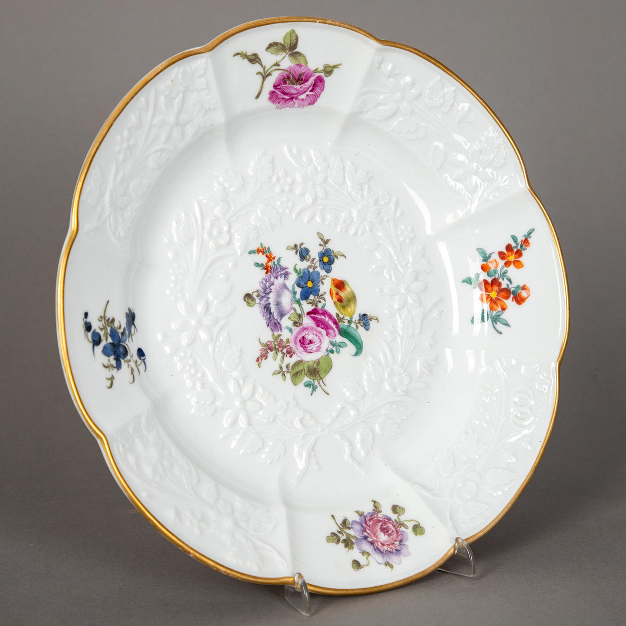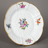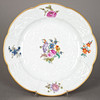 Weißporzellan mit farbiger Aufglasurmalerei und Goldrand. Entwurf von Johann Freidrich Eberlein um 1741-45. Geschweifter´Rand. Im Spiegel Blumenbouquet. Unterglasurblaue Schwertermarke. Dm: 24,5 cm.