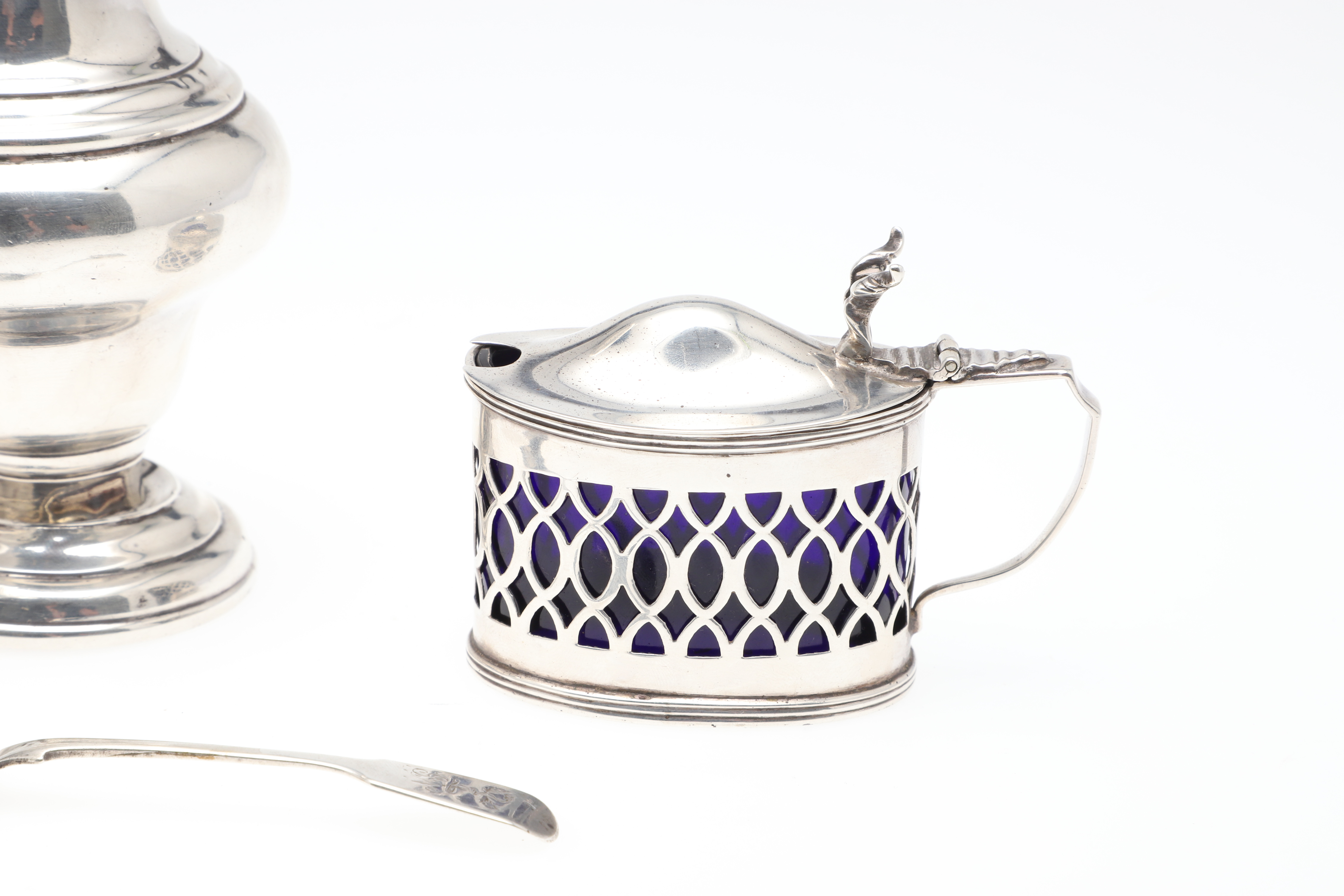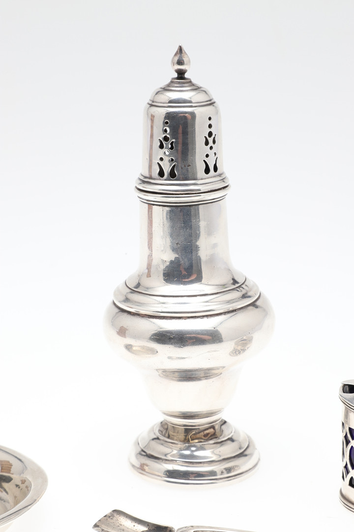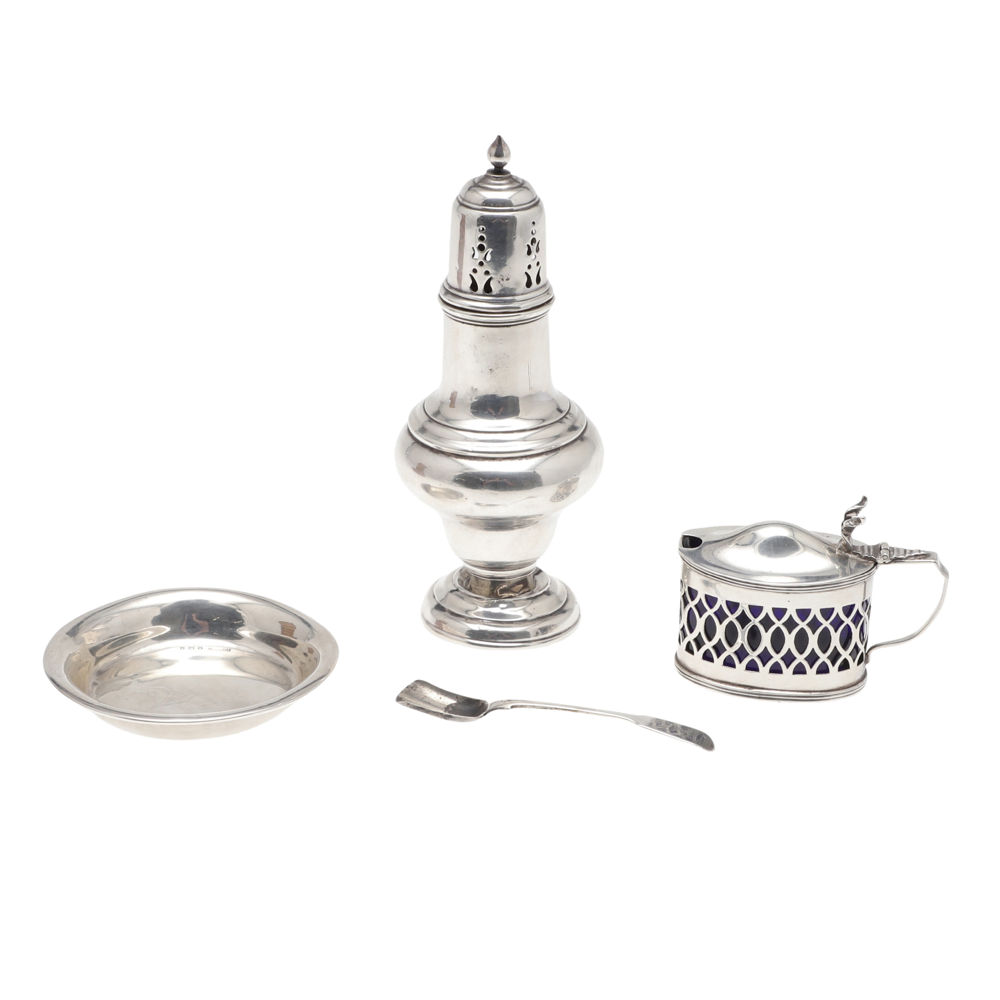 3570286. EINE SILBERNE ZUCKERDOSE, EIN SENFTOPF, EIN GEWÜRZLÖFFEL UND EINE SCHALE.