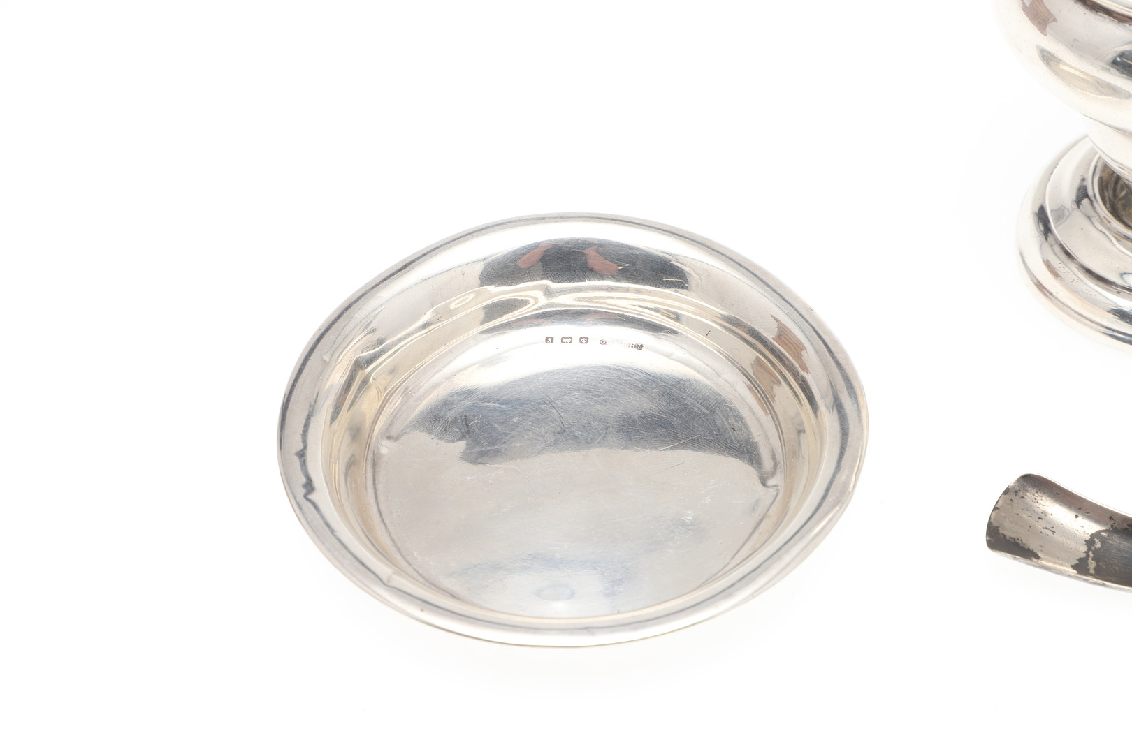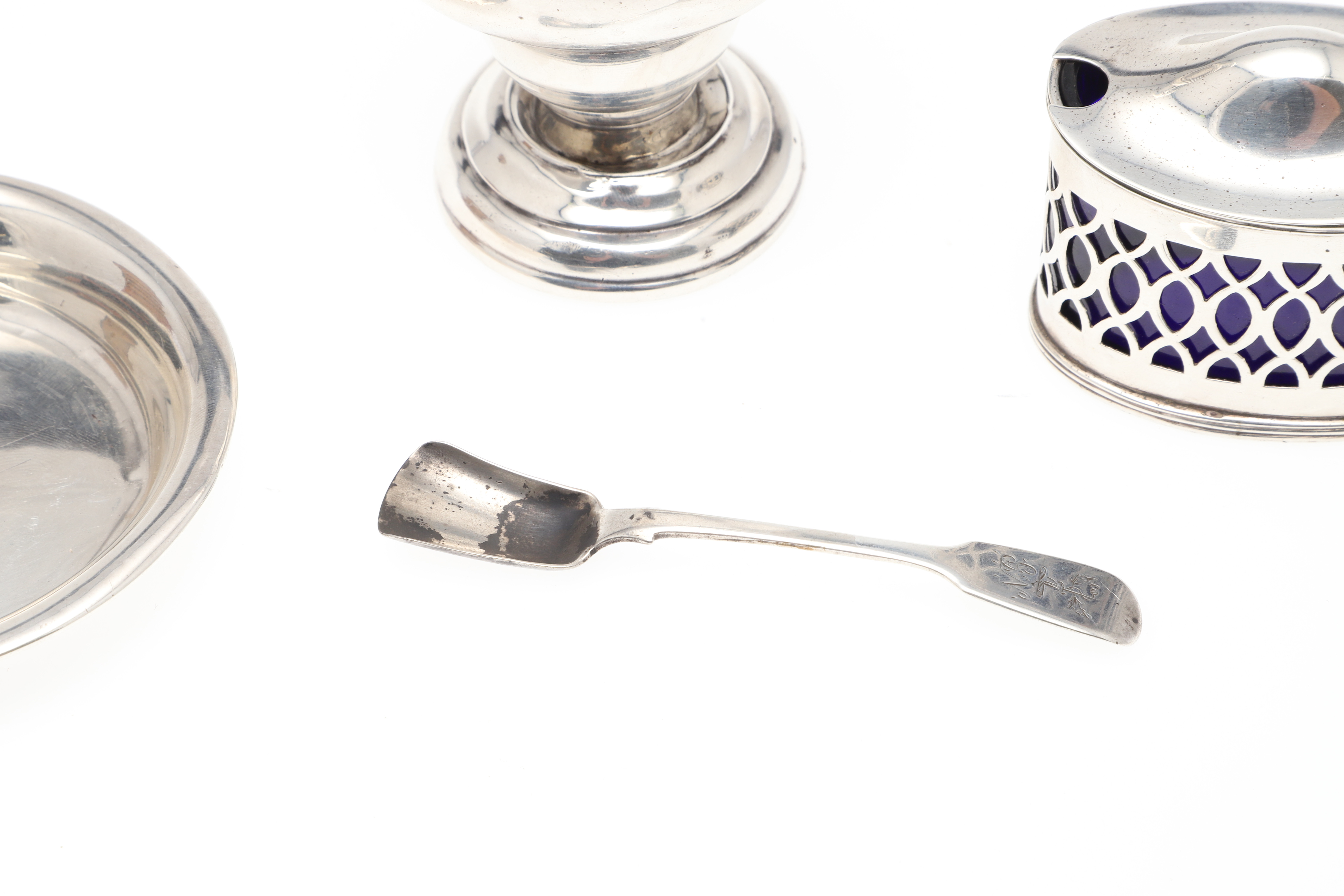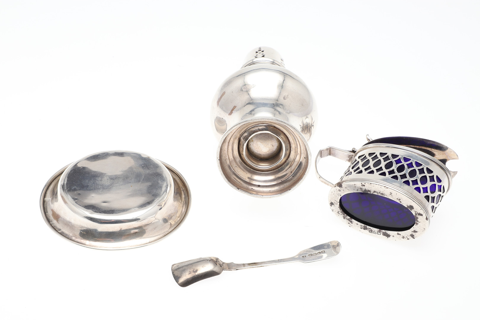 3570286. EINE SILBERNE ZUCKERDOSE, EIN SENFTOPF, EIN GEWÜRZLÖFFEL UND EINE SCHALE.