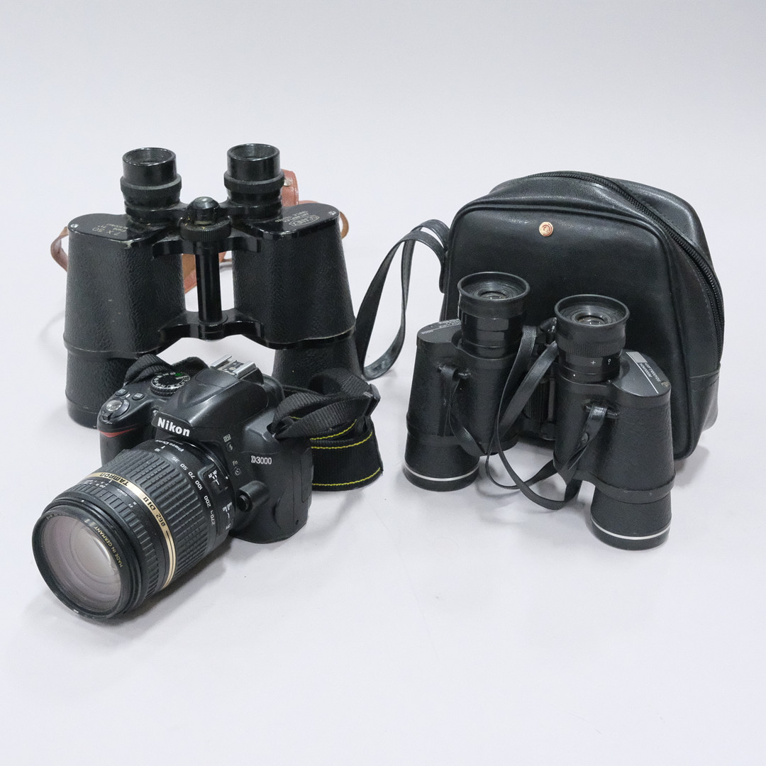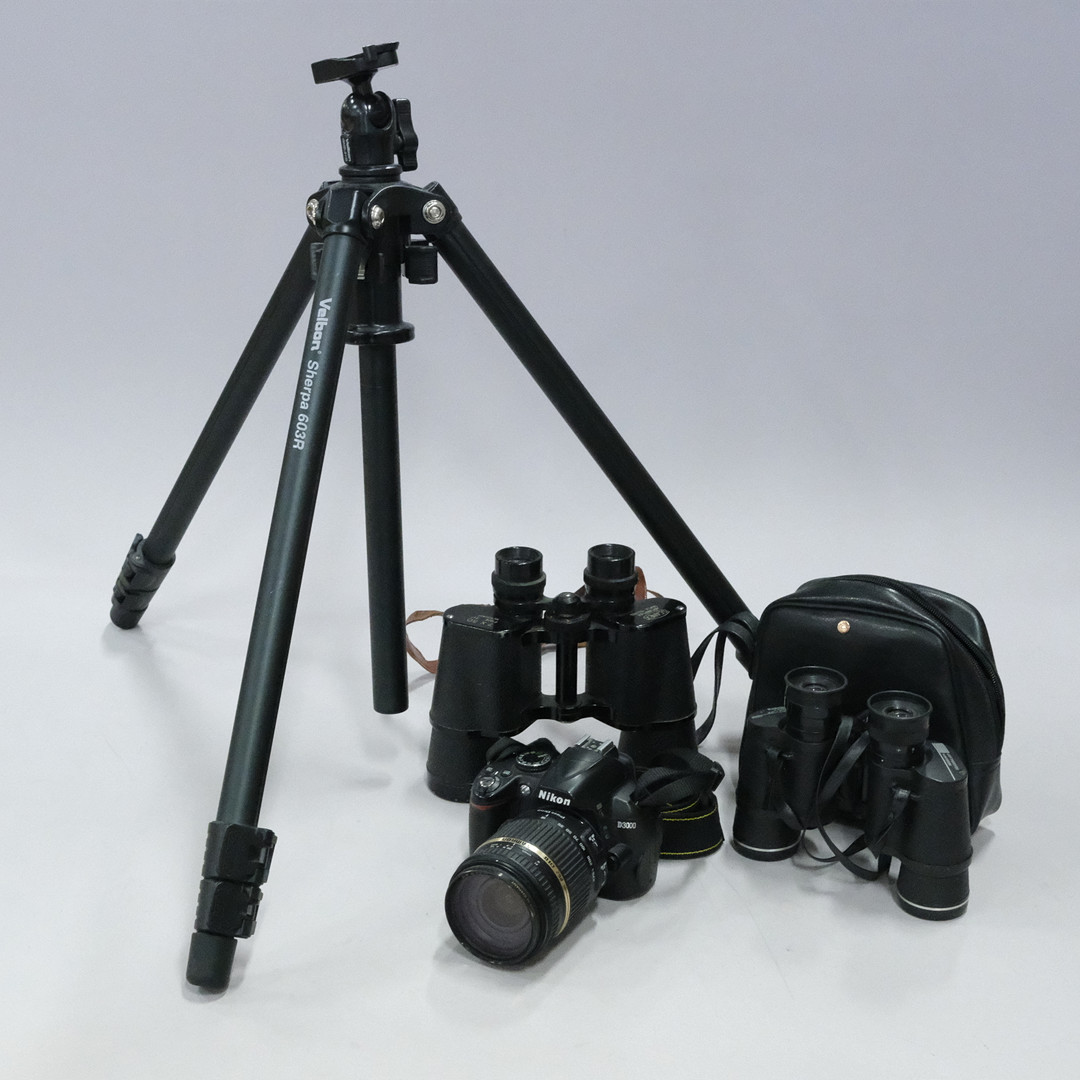 3577877. KAMERA, STATIV UND ZWEI FERNGLÄSER.