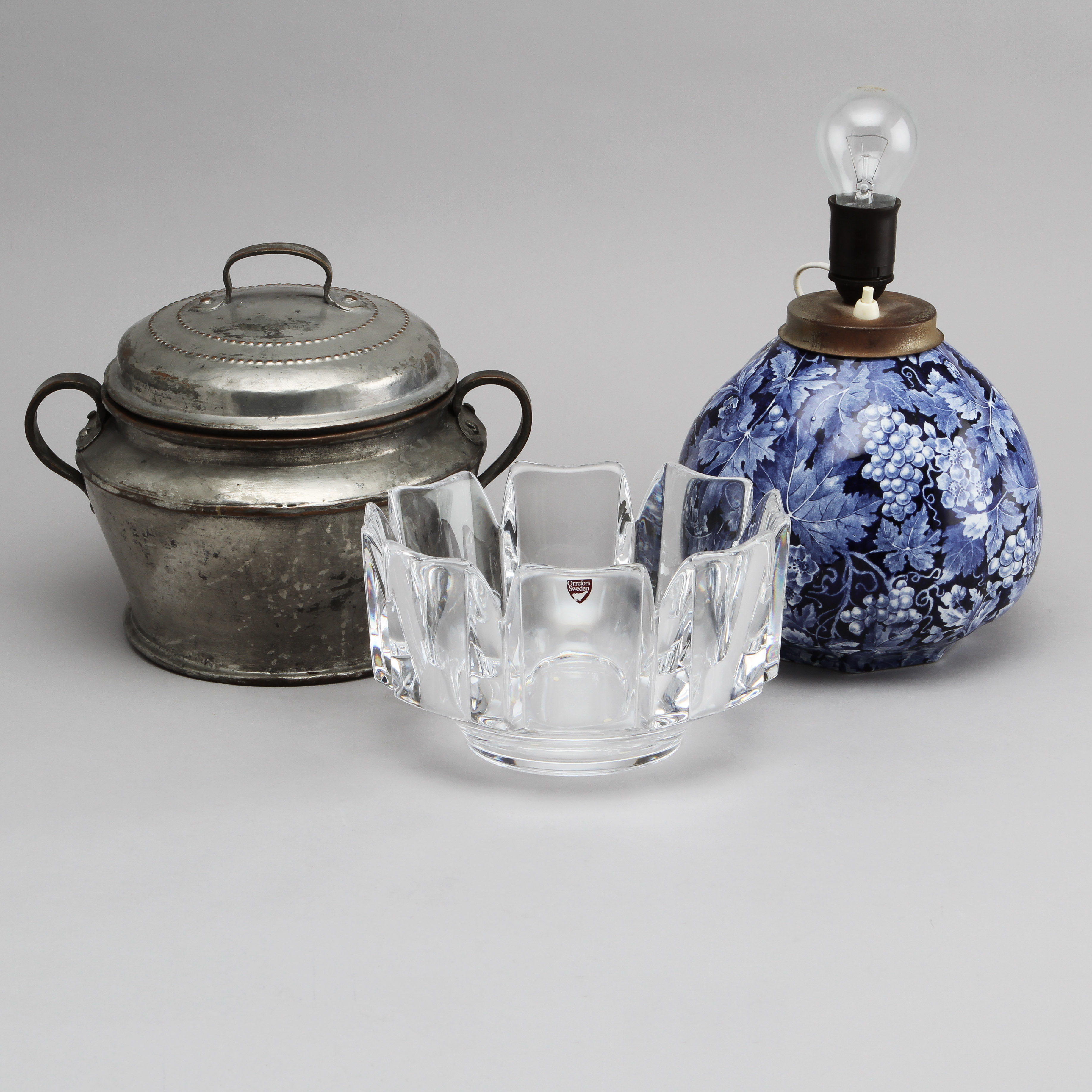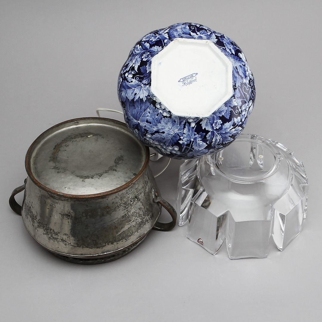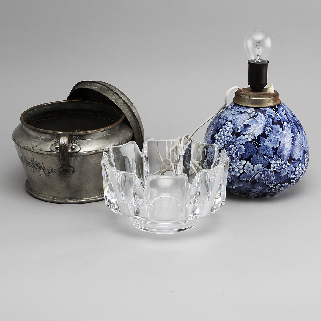 357917. SCHÜSSEL, TISCHLAMPE und DECKELKAROTTE.