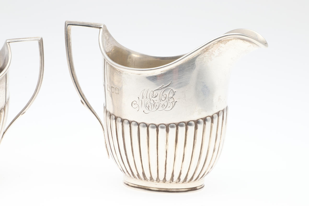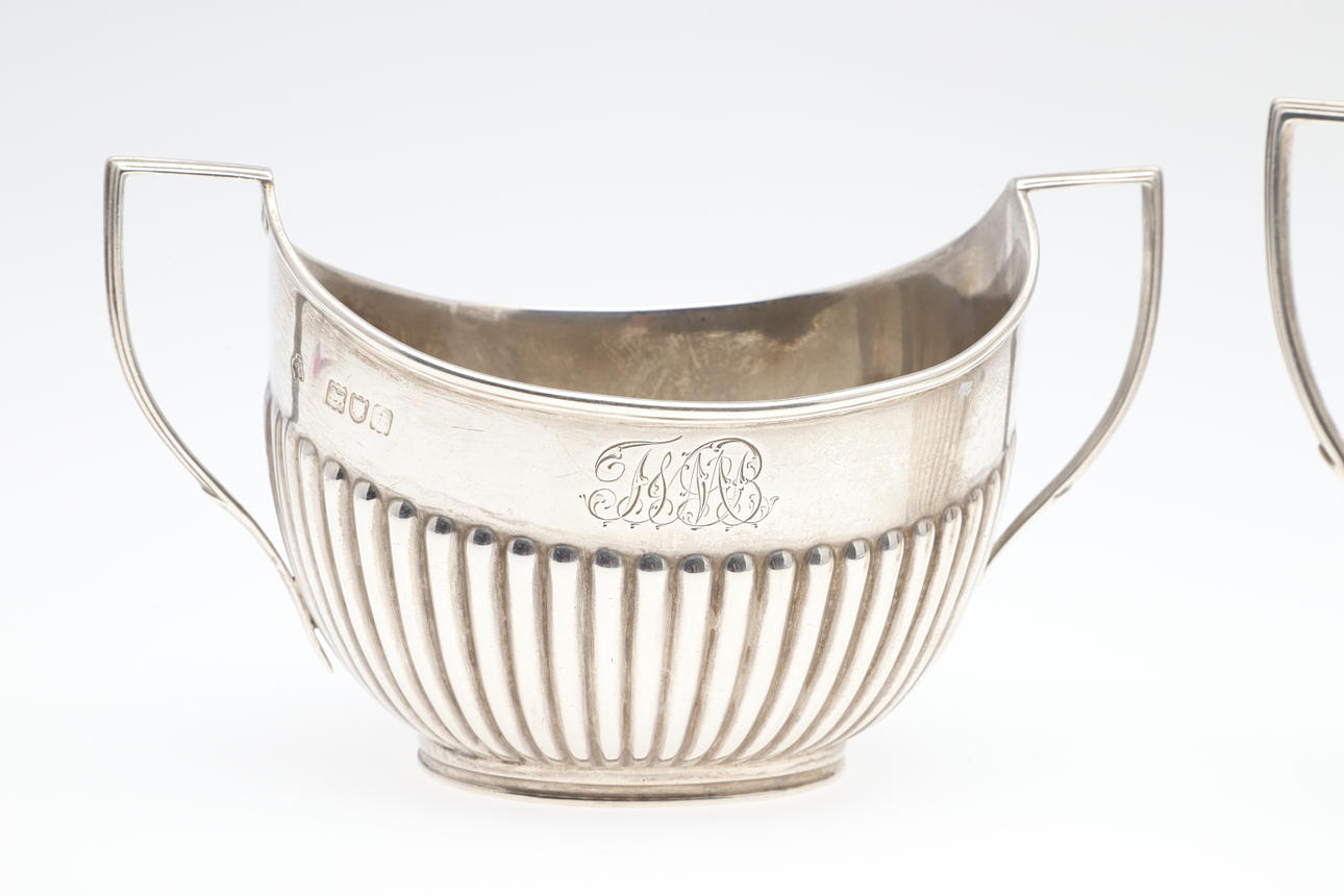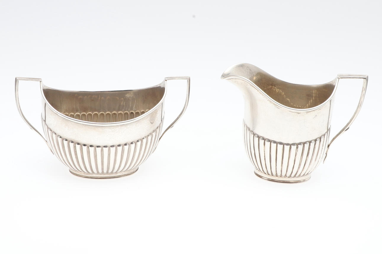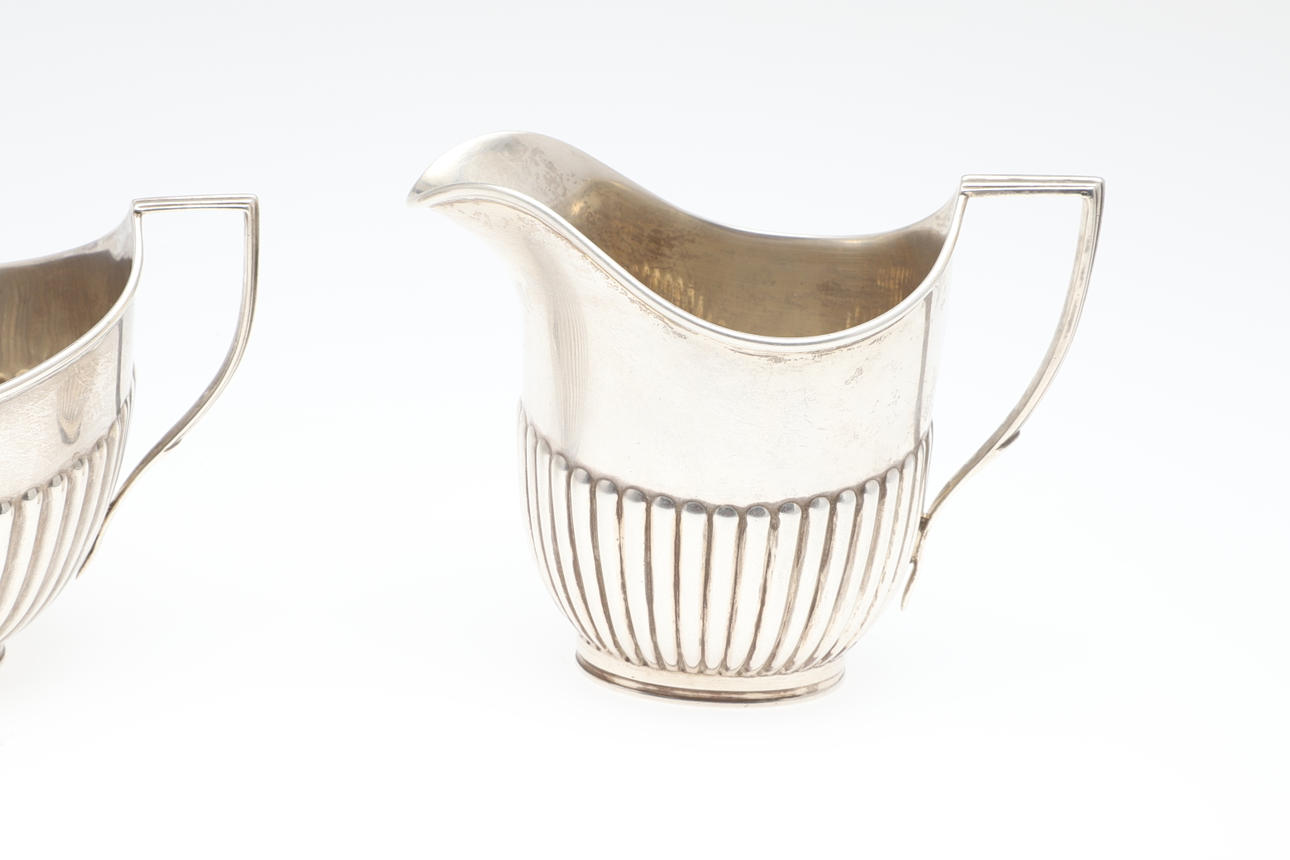 Ein silberner Milchkännchen mit Echtheitsstempel und eine Zuckerdose mit zwei Griffen, mit halbgeriffelten Korpus und jeweils gravierten Initialen. Markiert für London, 1899 und 1900. Insgesamt ca. 14 Unzen.