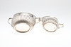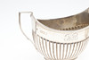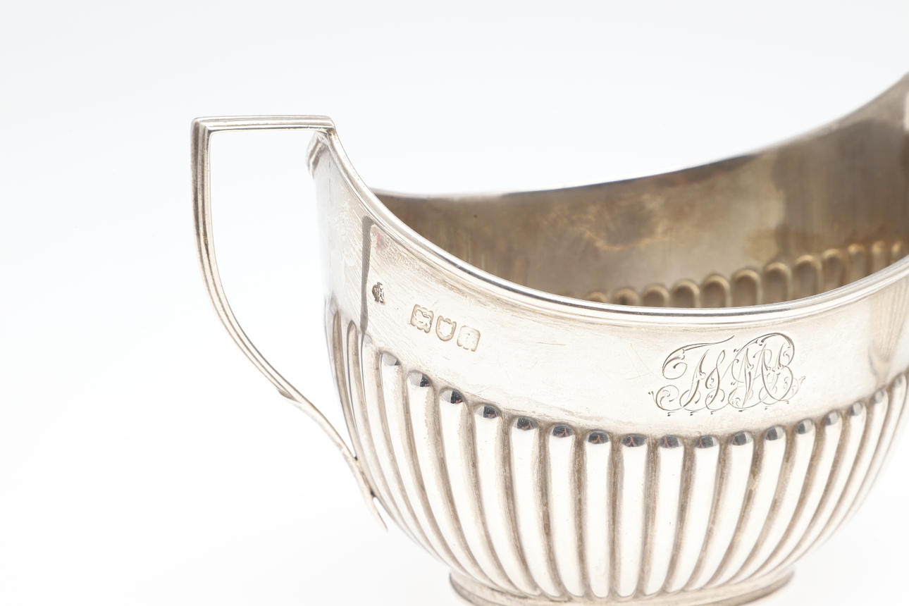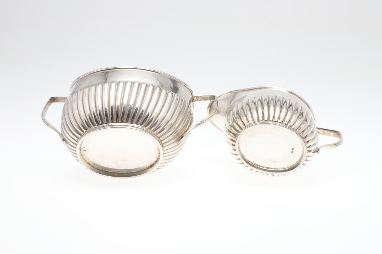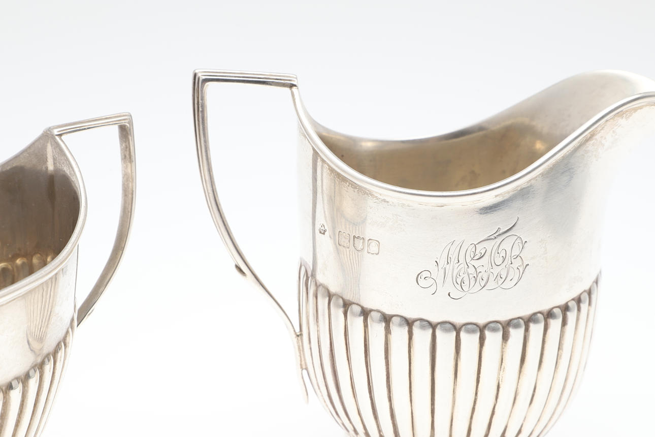 Ein silberner Milchkännchen mit Echtheitsstempel und eine Zuckerdose mit zwei Griffen, mit halbgeriffelten Korpus und jeweils gravierten Initialen. Markiert für London, 1899 und 1900. Insgesamt ca. 14 Unzen.