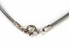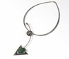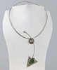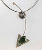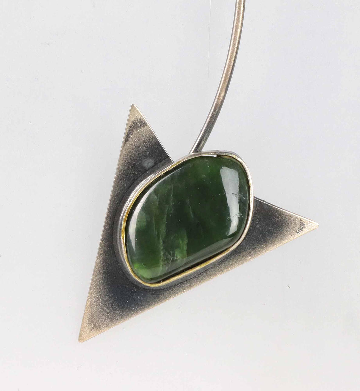 Der Statement Anhänger ist punziert Silber 925, Handarbeit sowie *BU* für Büttner Schmuck Bad Suderode. Geometrische Arbeit in runder und dreipassiger durch Rundbogen verbundener Form, mit Jade von ca. 25 x 20 mm in Vegetableform in glatter Zarge besetzt. Anhängerlänge ca. 13,5 cm. Dazu siebensträngiger teils geschwärzter Silberreif. Länge mit Federringschließe ca. 46 cm.