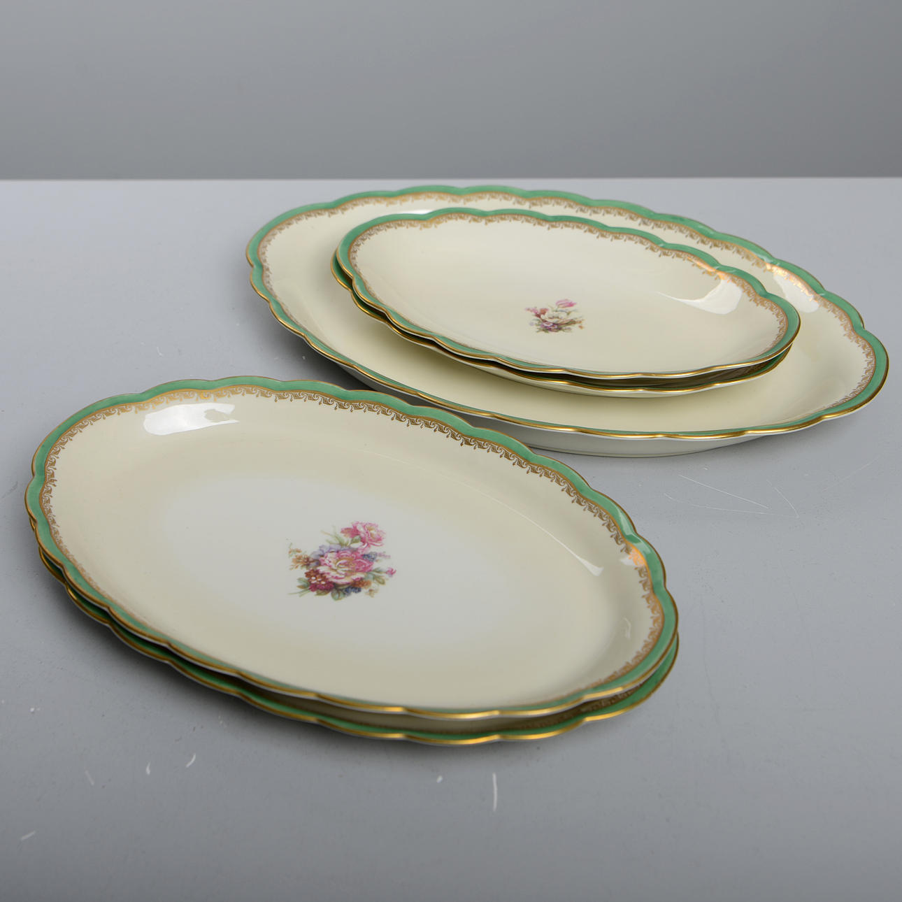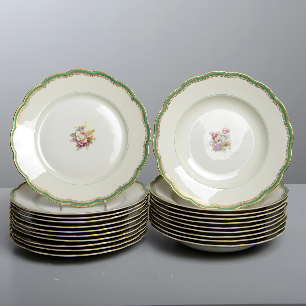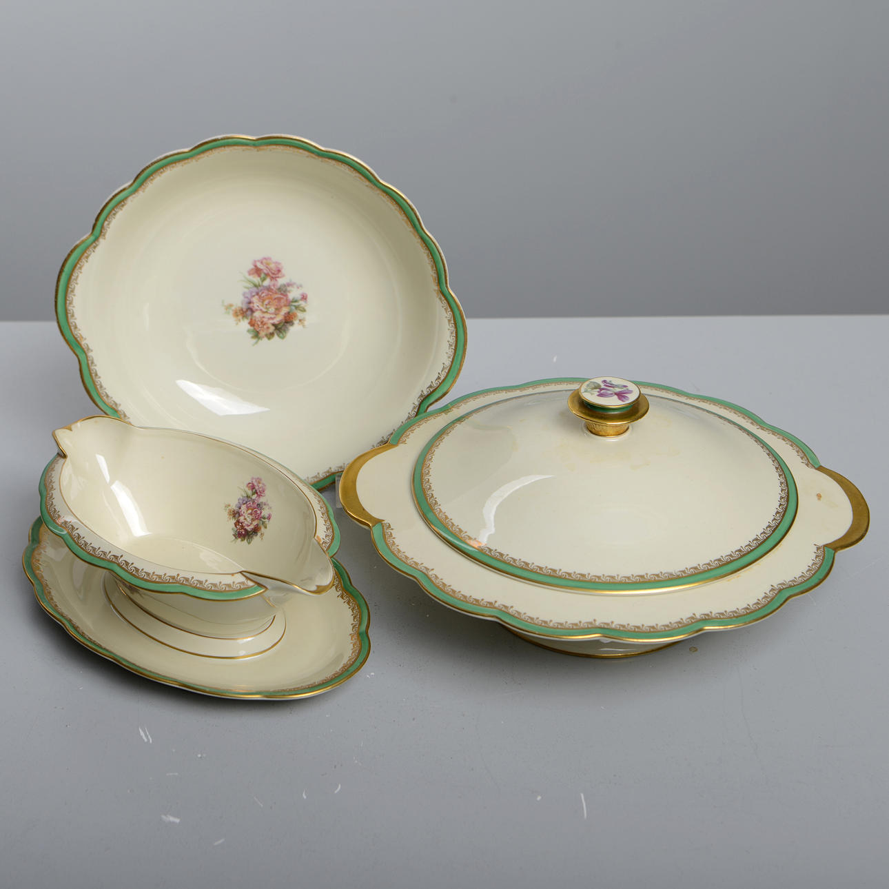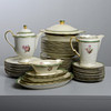 porzellan. 11 Speiseteller, 10 tiefe Teller, 11 Vorspeisenteller, 11 Beilagen, 4 Servierteller, 1 Schüssel, 1 Terrine, 2 Krüge und 1 Saucenschüssel.