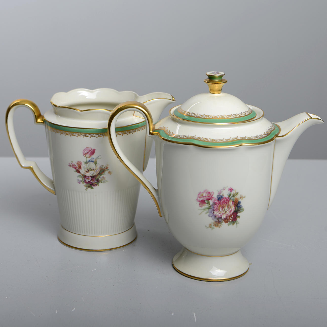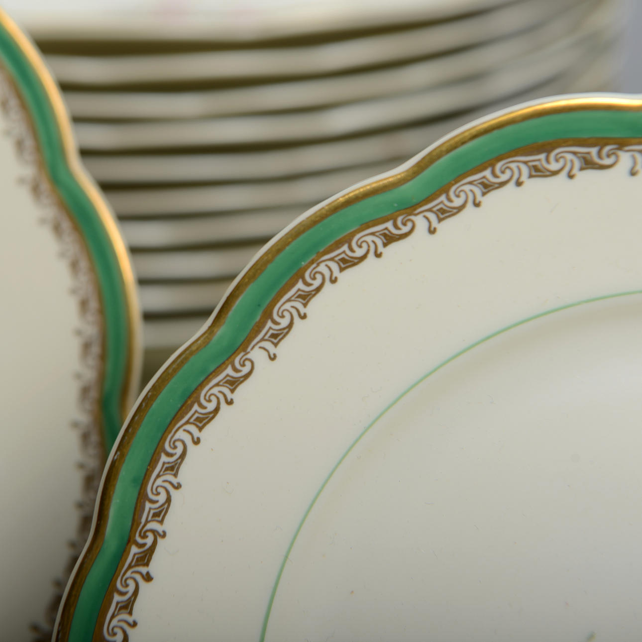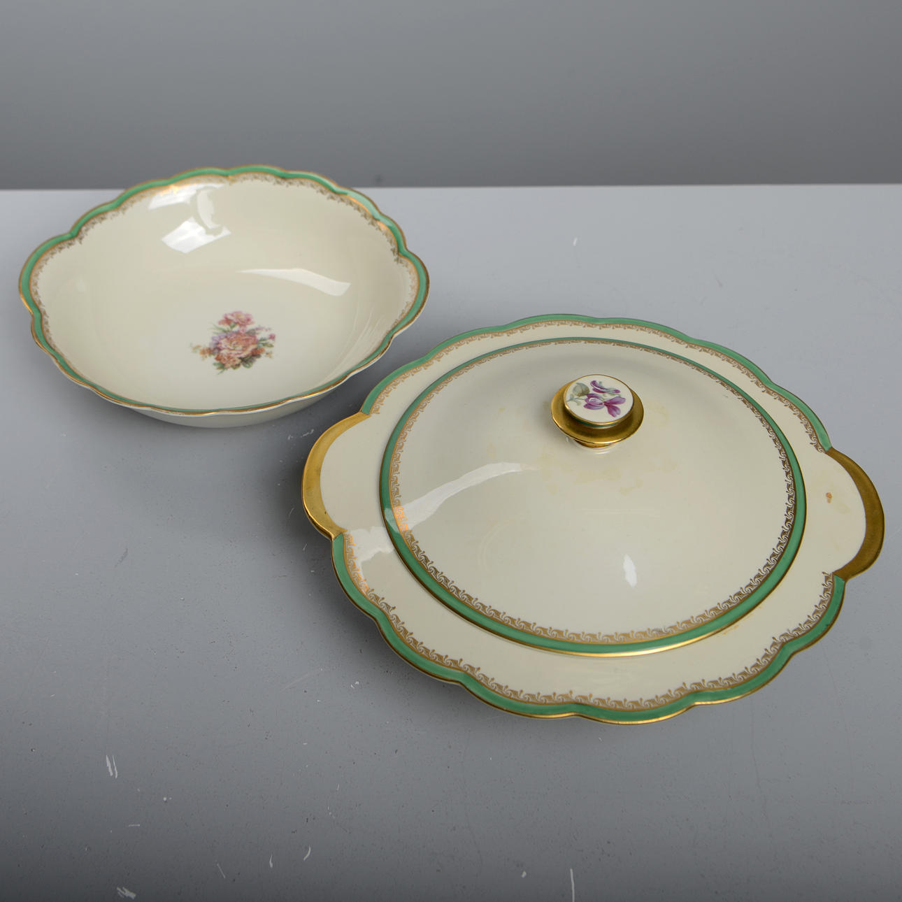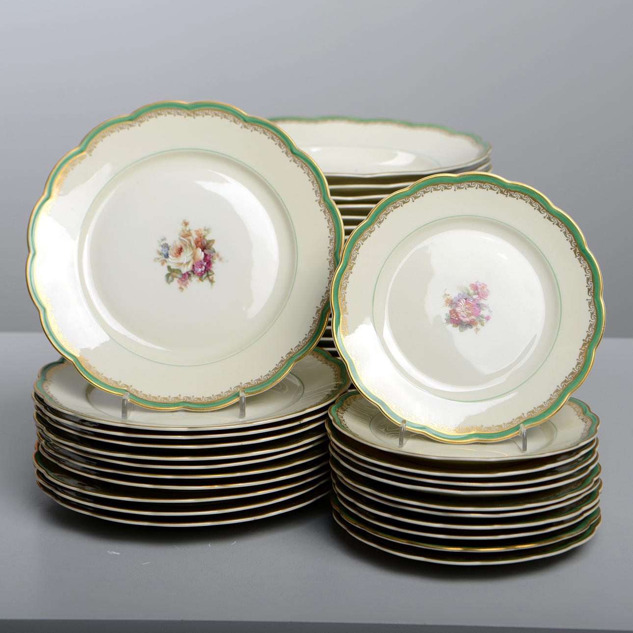porzellan. 11 Speiseteller, 10 tiefe Teller, 11 Vorspeisenteller, 11 Beilagen, 4 Servierteller, 1 Schüssel, 1 Terrine, 2 Krüge und 1 Saucenschüssel.