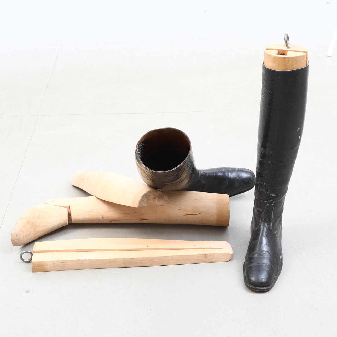 Ältere Reitstiefel aus Leder mit zugehörigen Sporen sowie Stiefelblöcke aus Holz.
