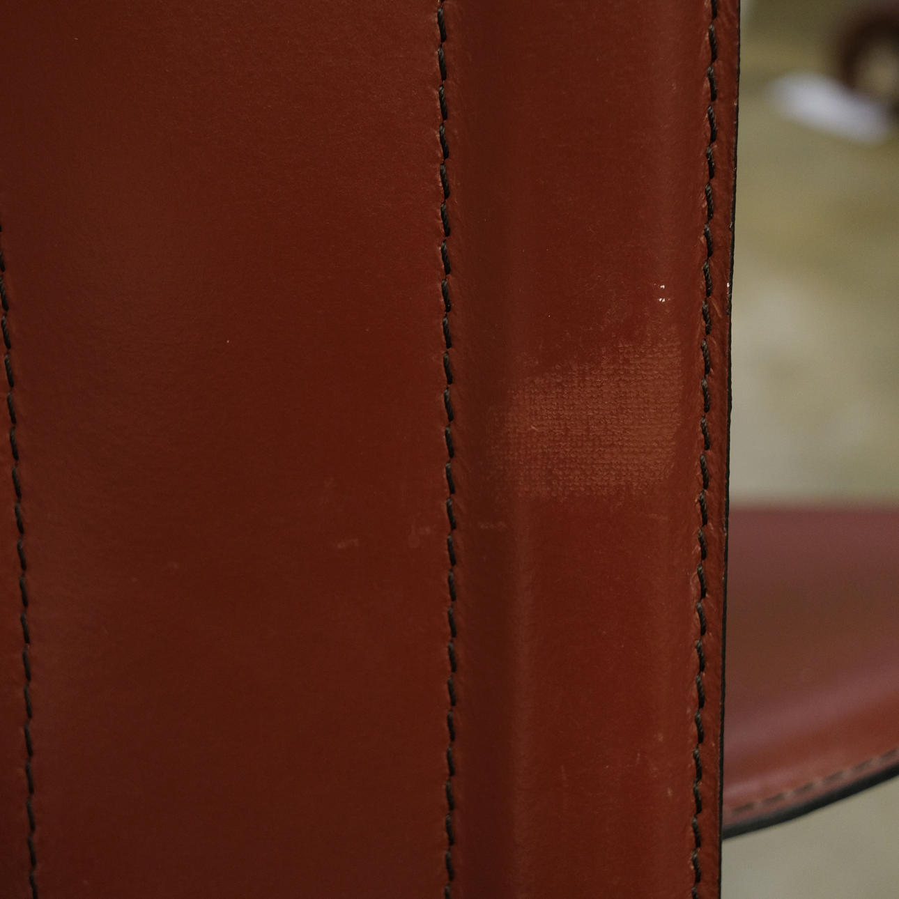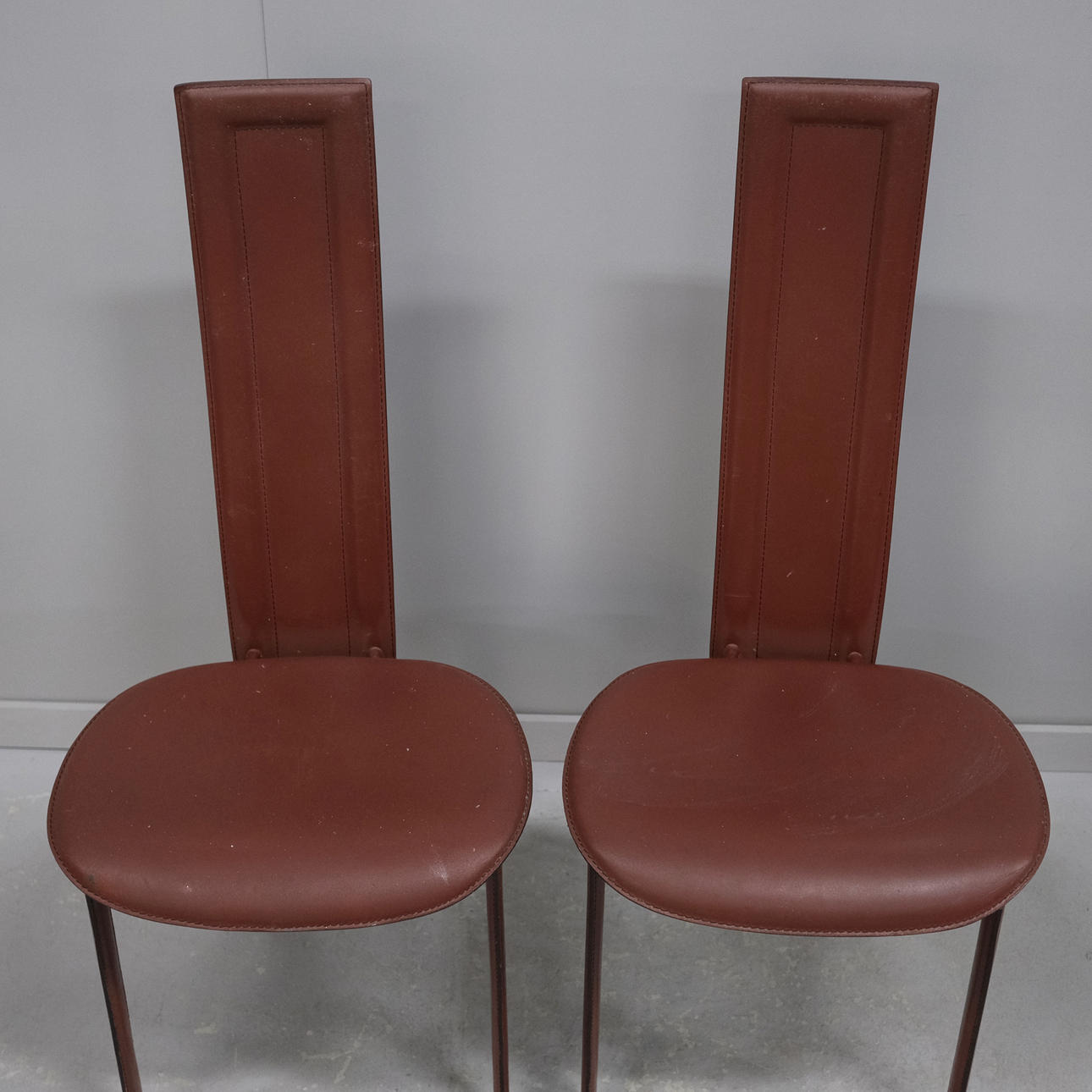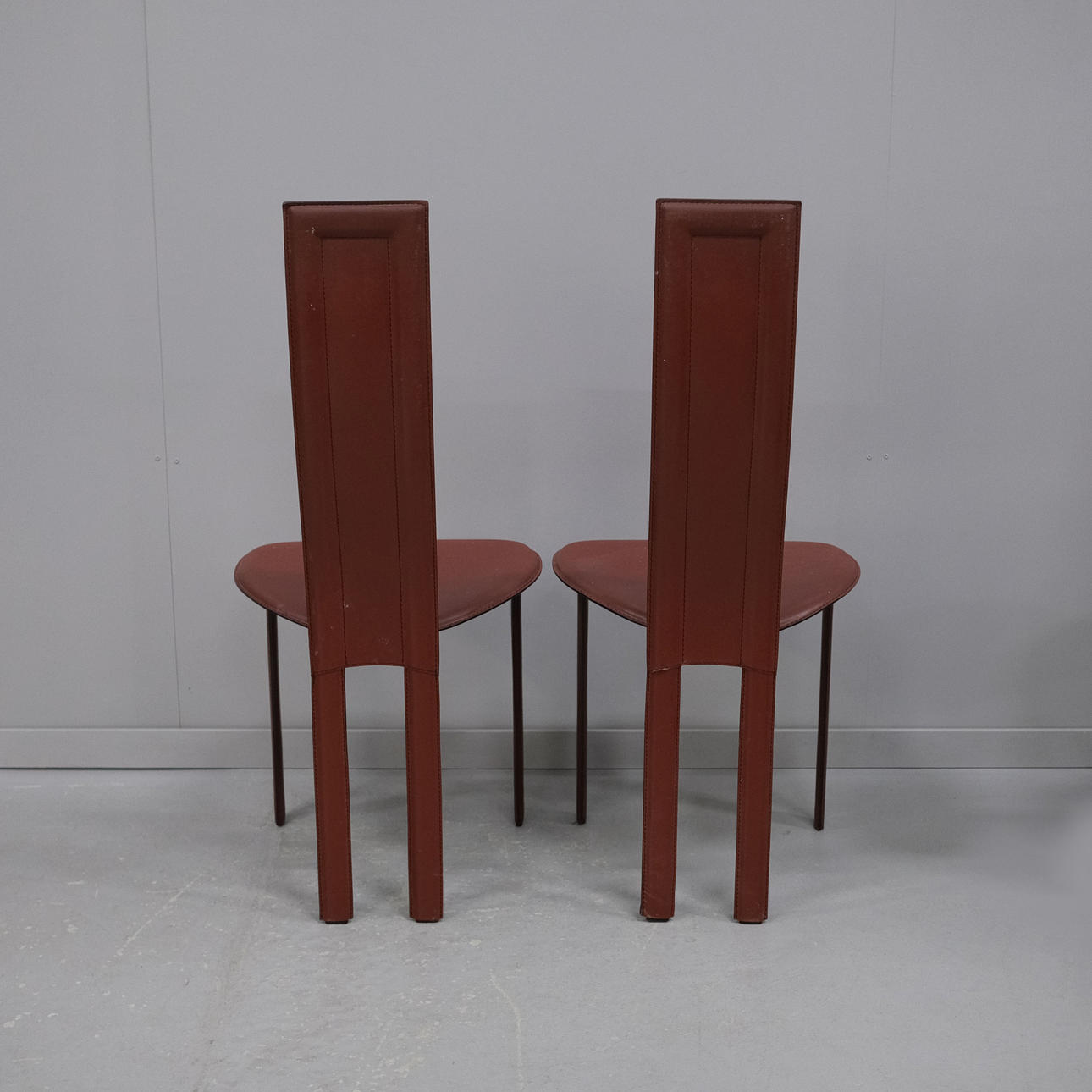 Rote Lederpolsterung. Zwei Stühle sind beschriftet. Höhe: ca. 105 cm Sitzhöhe: ca. 48 cm
