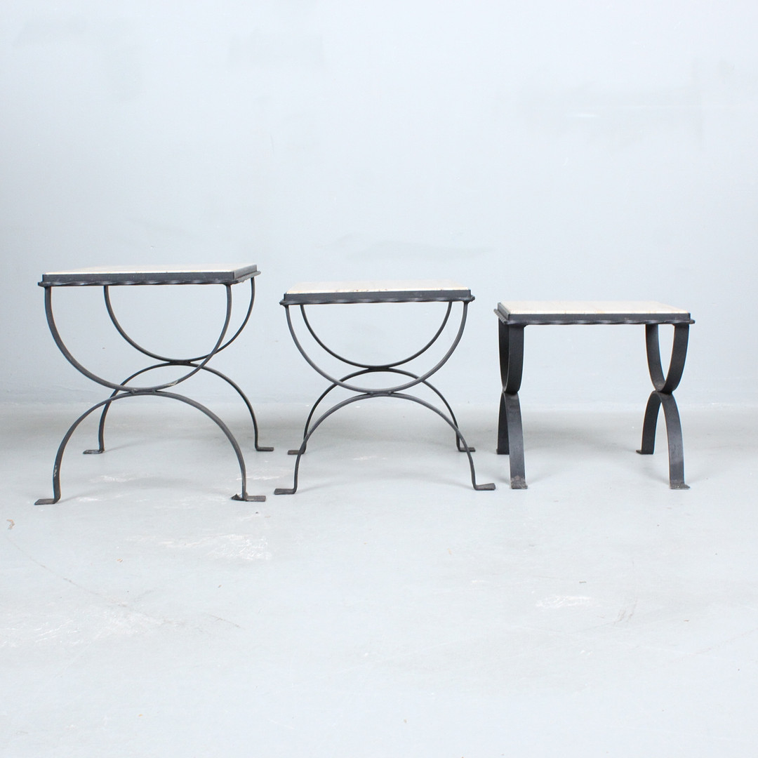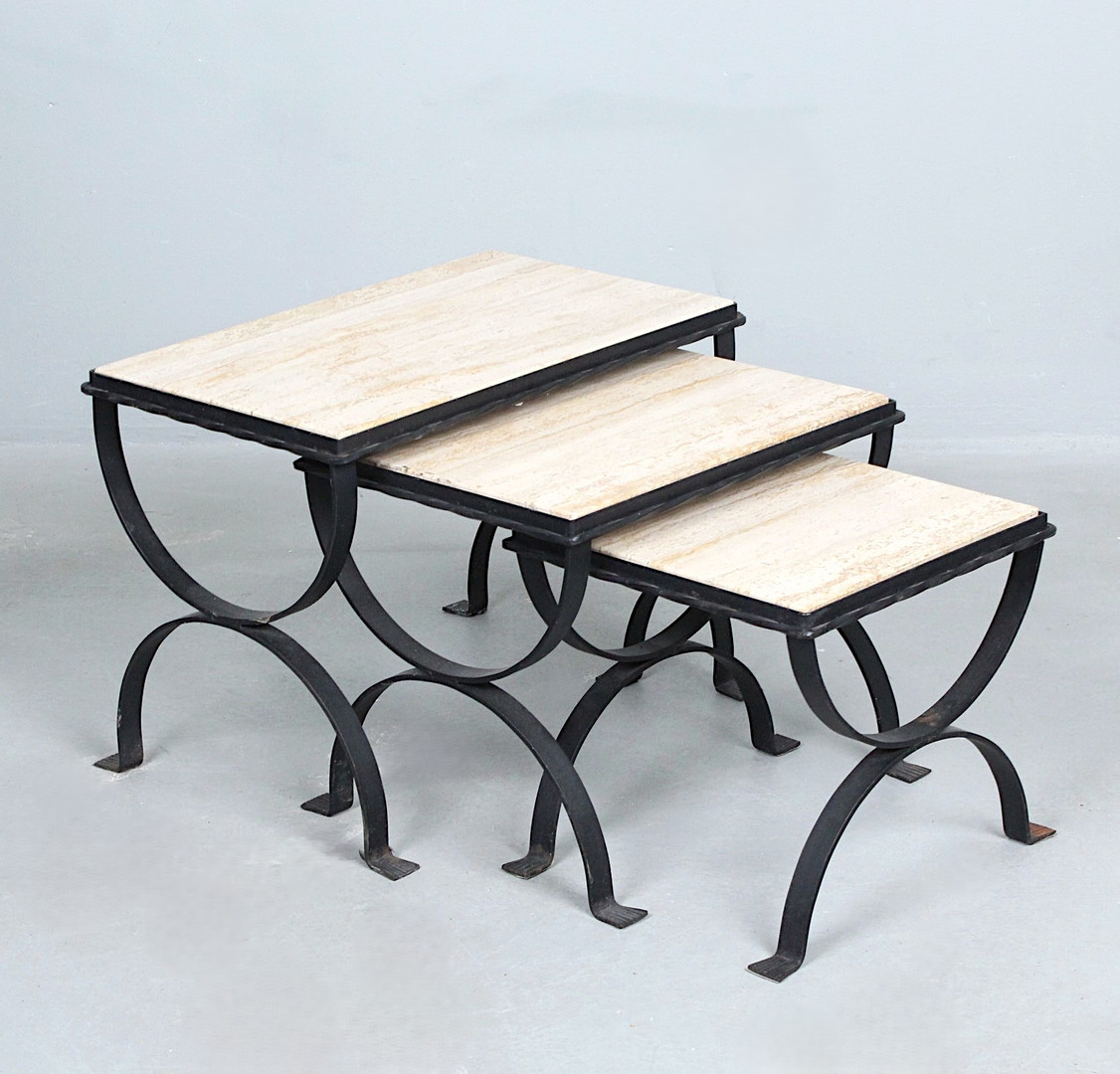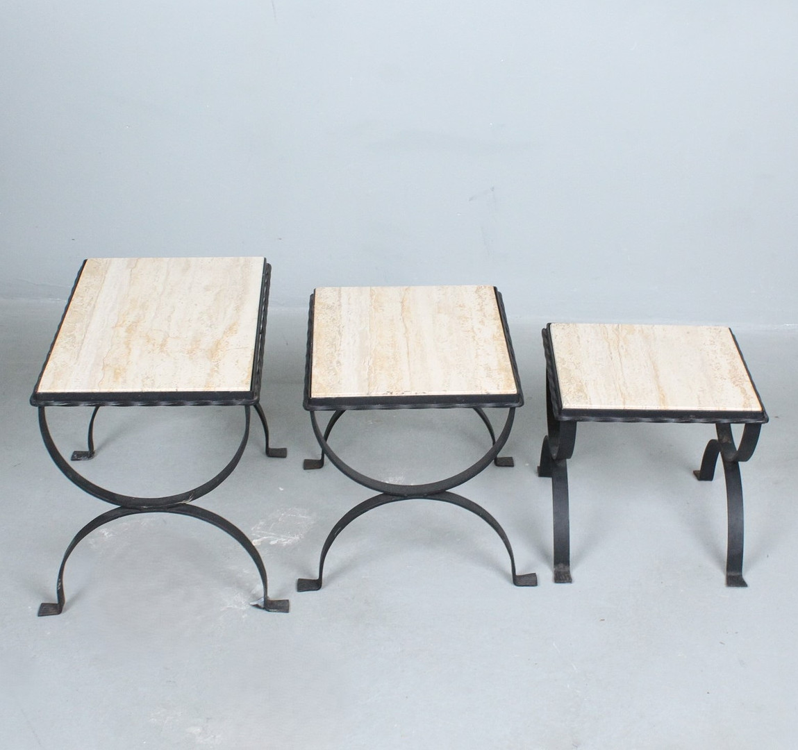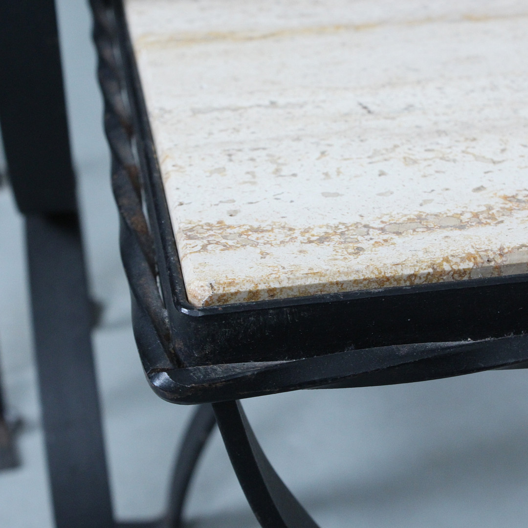 3596449. Brutalistische Satztische mit Travertinplatten.