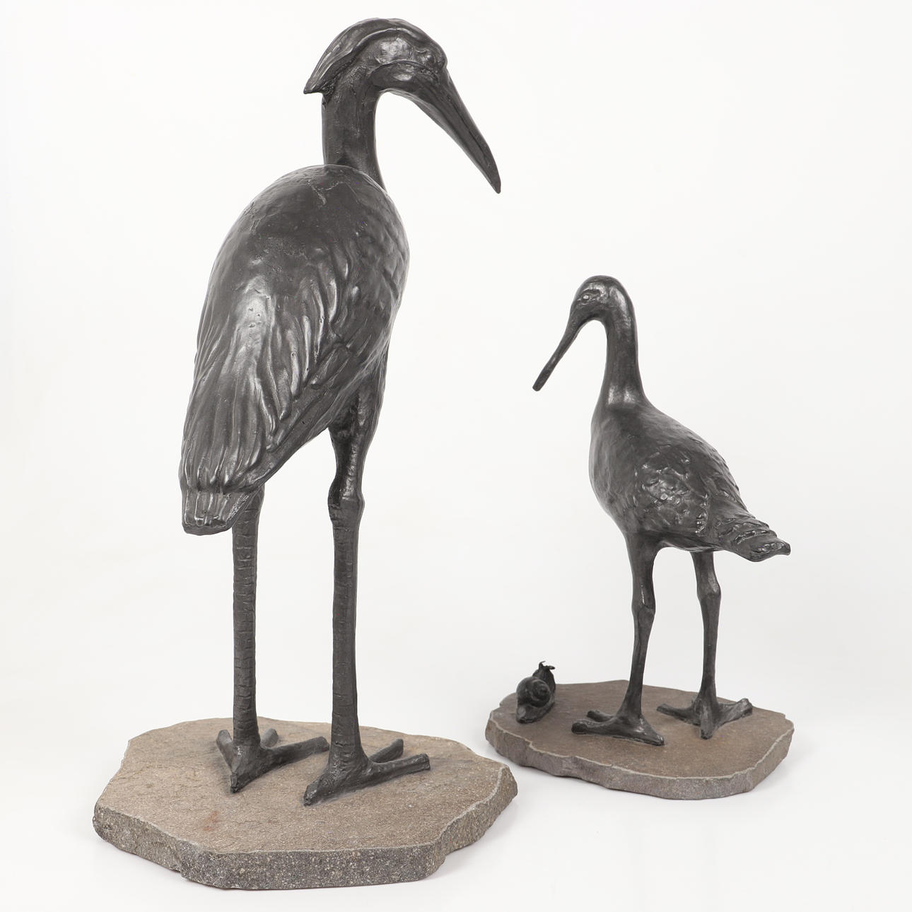 3600548. SKULPTUREN, 2 Stück, Vögel, Kunststoff mit Steinplatte.