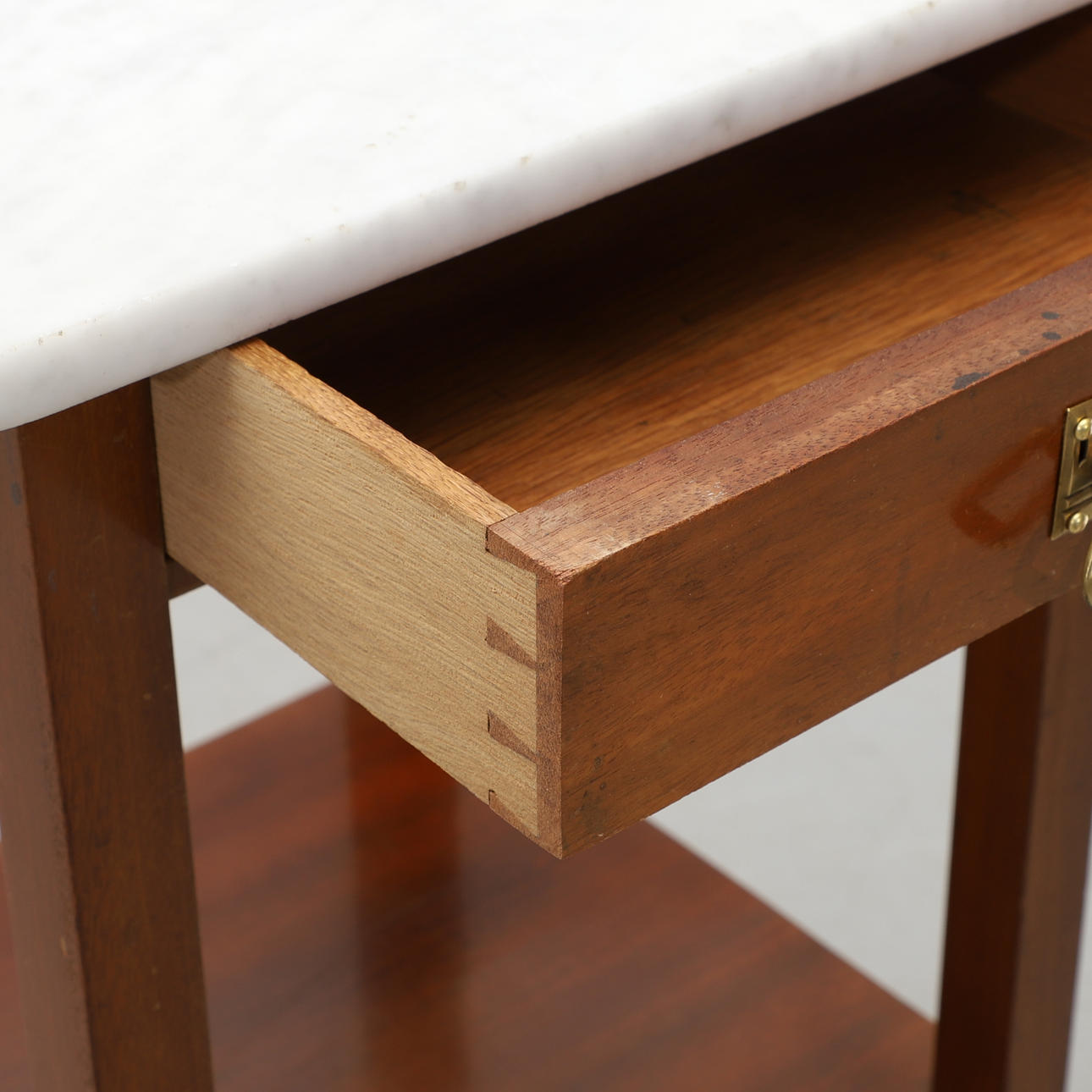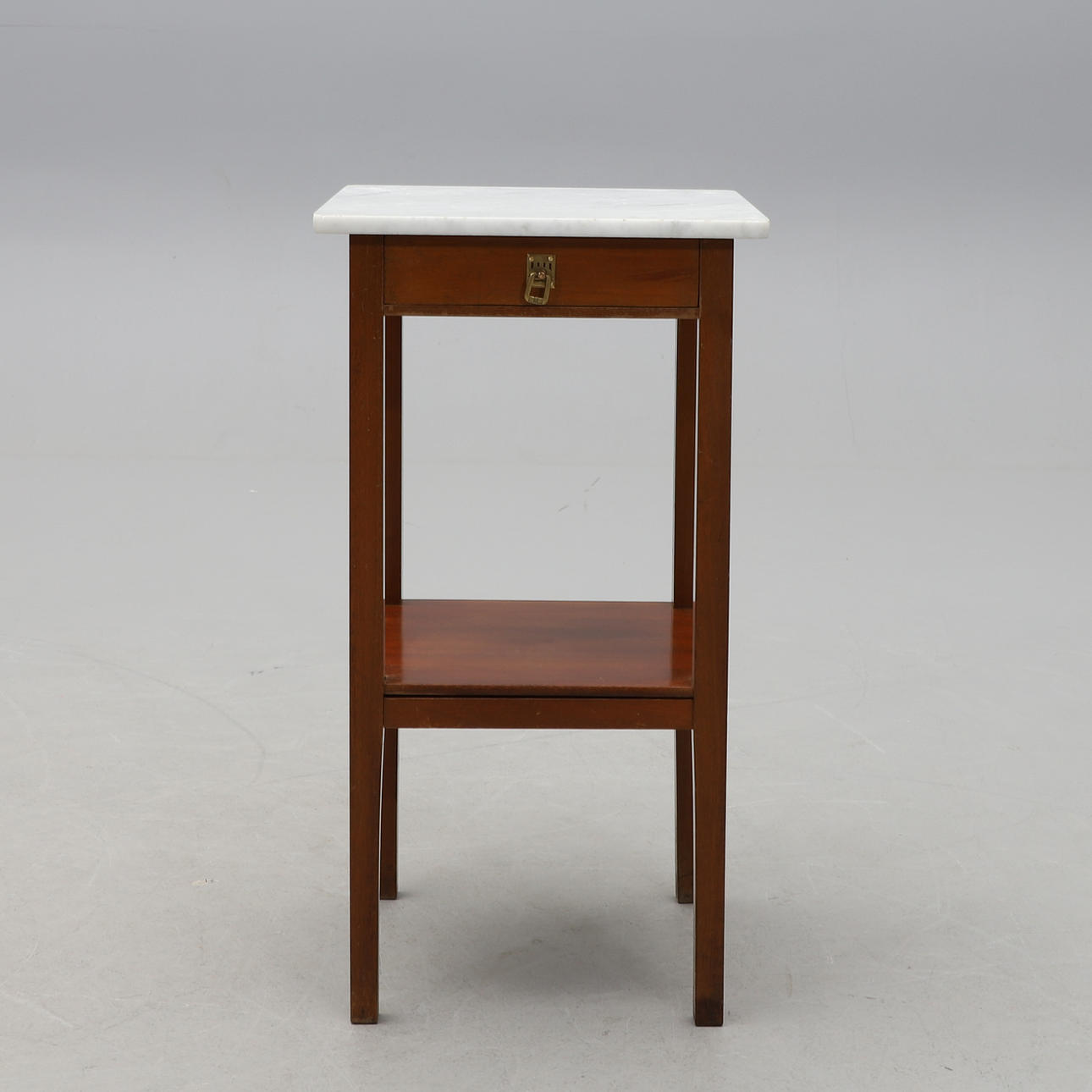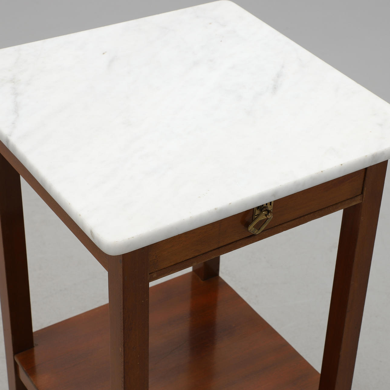 Marmorplatte. Rahmen aus Eiche. Kiste im Sargen. Beschläge aus Messing. Regal unten. 40 x 40, Höhe 74,5 cm.