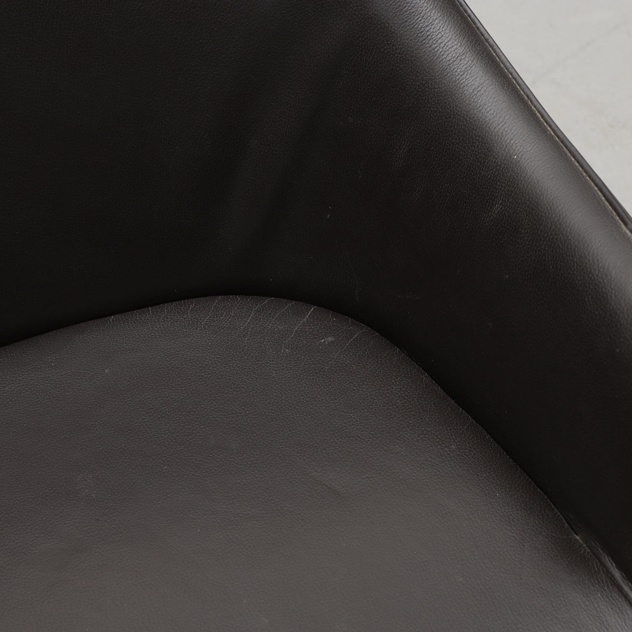 Beinständer aus Kunststoff. Dunkelbraune Lederpolsterung. Bemerkt. Sitzhöhe 47, Breite 60, Rückenhöhe 82 cm.