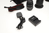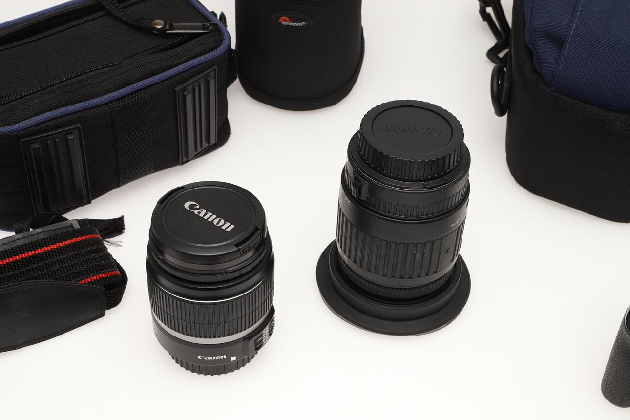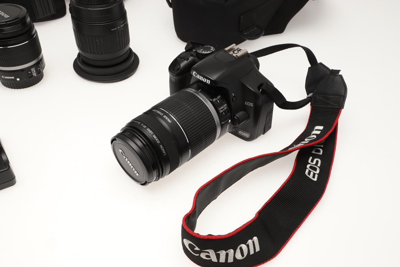 Eine Canon EOS 450D-Kamera mit einem Cannon EF-S-Objektiv (55-250 mm), einem Canon-Zoomobjektiv (18-55 mm), einem Sigma-Objektiv (28-200 mm), einem Akkuladegerät, einer Broschüre usw.