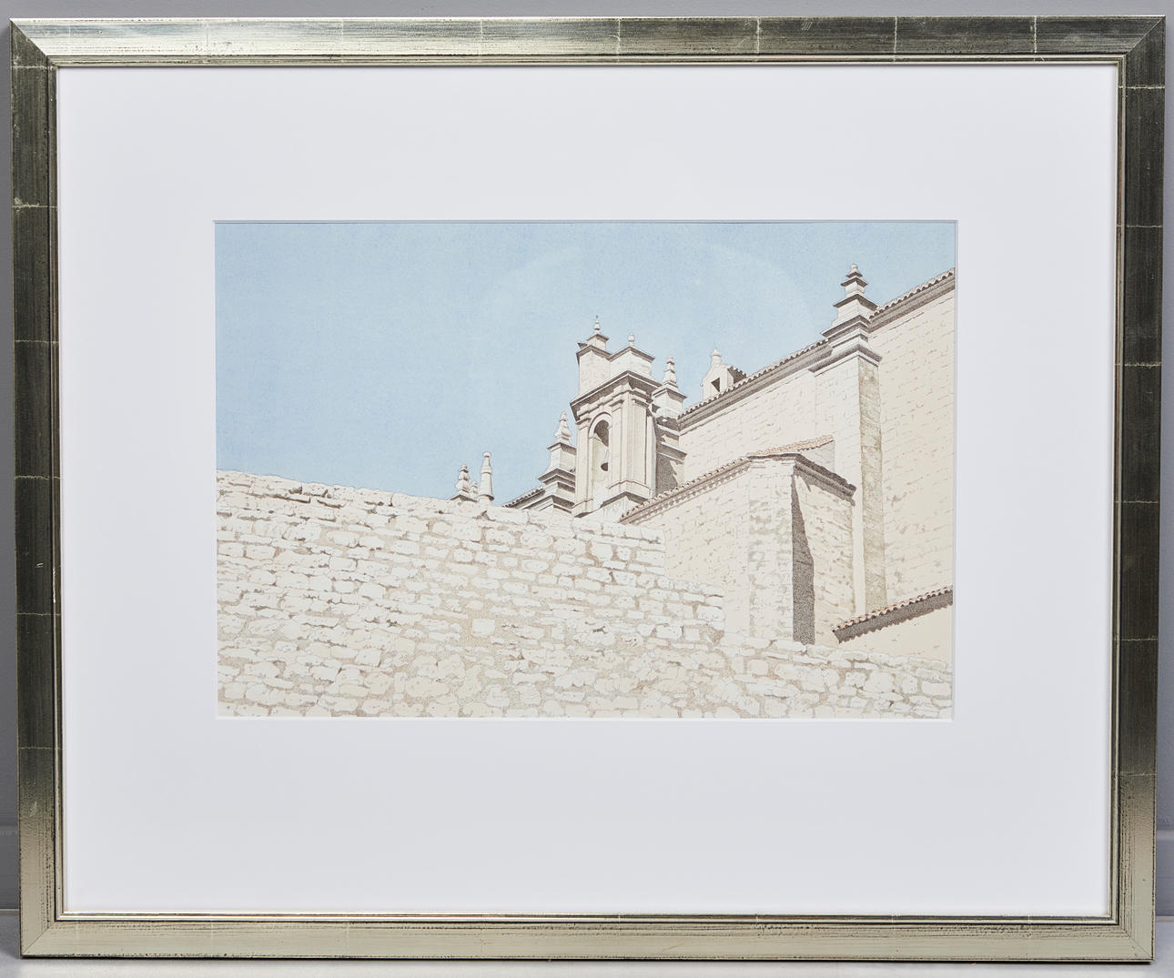 Lothar Braun (geb. 1931), Steinmauer vor Glockenturm, Aquarell und Zeichnung auf Papier, signiert, ca. 33 x 49 cm, hinter Passepartout und Glas gerahmt, mit Rahmen ca. 62,5 x 75,5 cm.