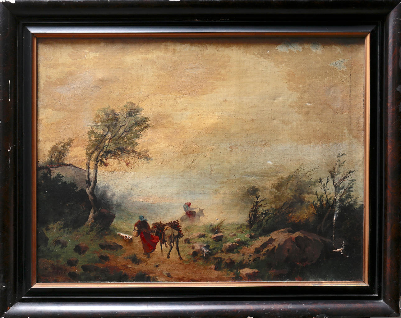 Brüche, alte Restaurierungen, Neulackierungen und Beschädigungen. Bemalter Holzrahmen, mit Fehlern.