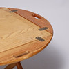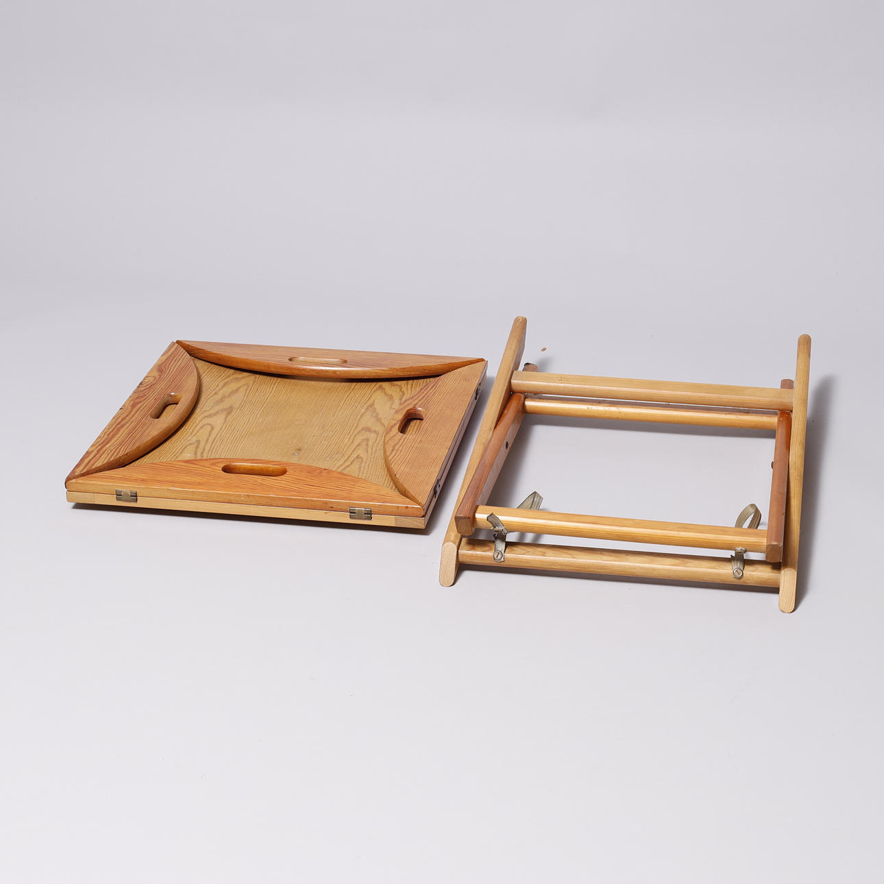 Tablett aus teilweise lackiertem Kiefernholz, mit Klapprahmen und abnehmbarem Tablett mit patinierten Messingbeschlägen.