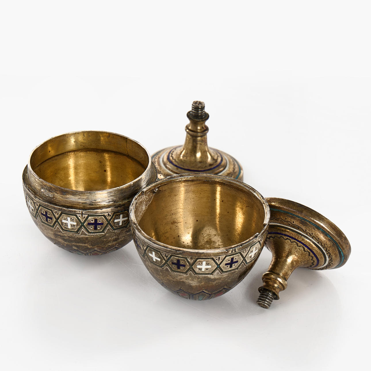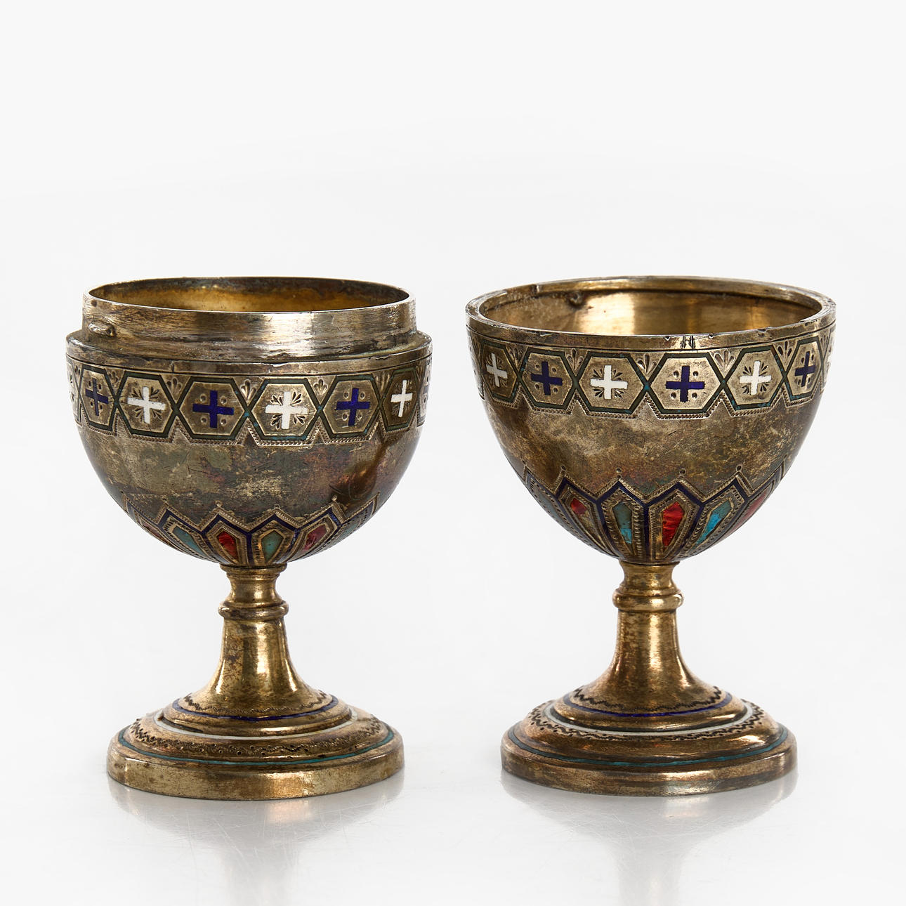 REISE-EIERBECHER, 1 Paar, Silber, Emaille, vermutlich Russland.
