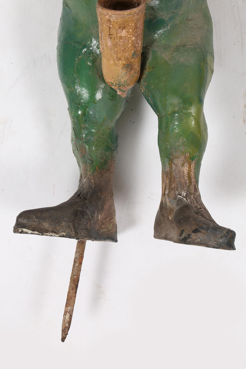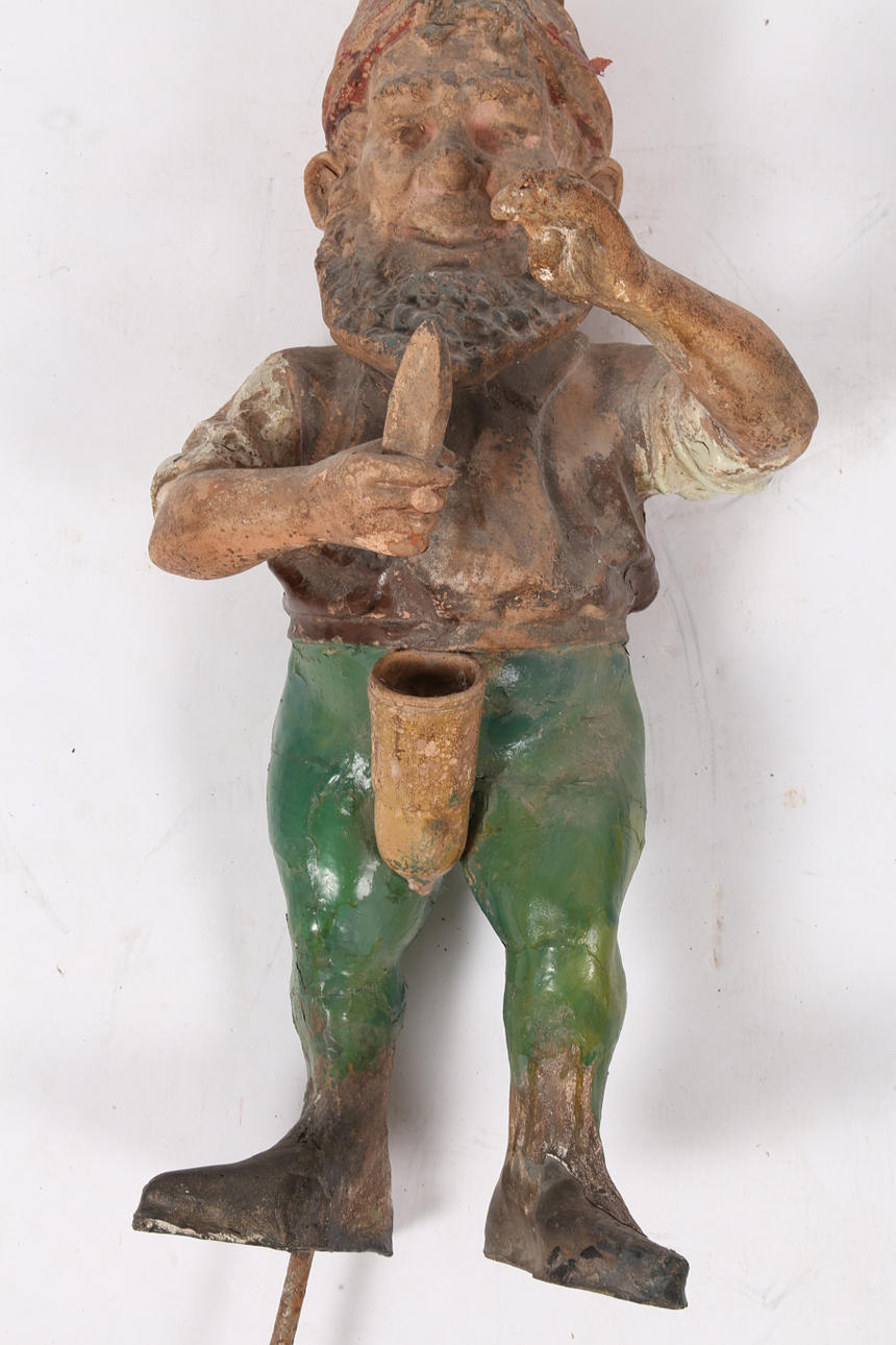 Mit rot lackiertem Hut und grüner Hose, Metallfüßen und mit Stachel zum Aufstellen, ca. 80 cm hoch inklusive Spieß.