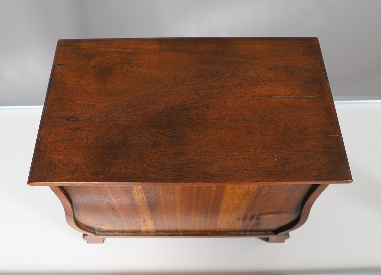 Die Holzkonstruktion mit vier langen, abgestuften Schublade mit Messinggriffen stand auf Konsolenfüßen. Höhe 34,5 cm x Breite 40 cm x Tiefe 23 cm.