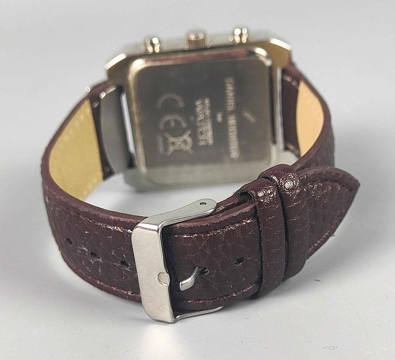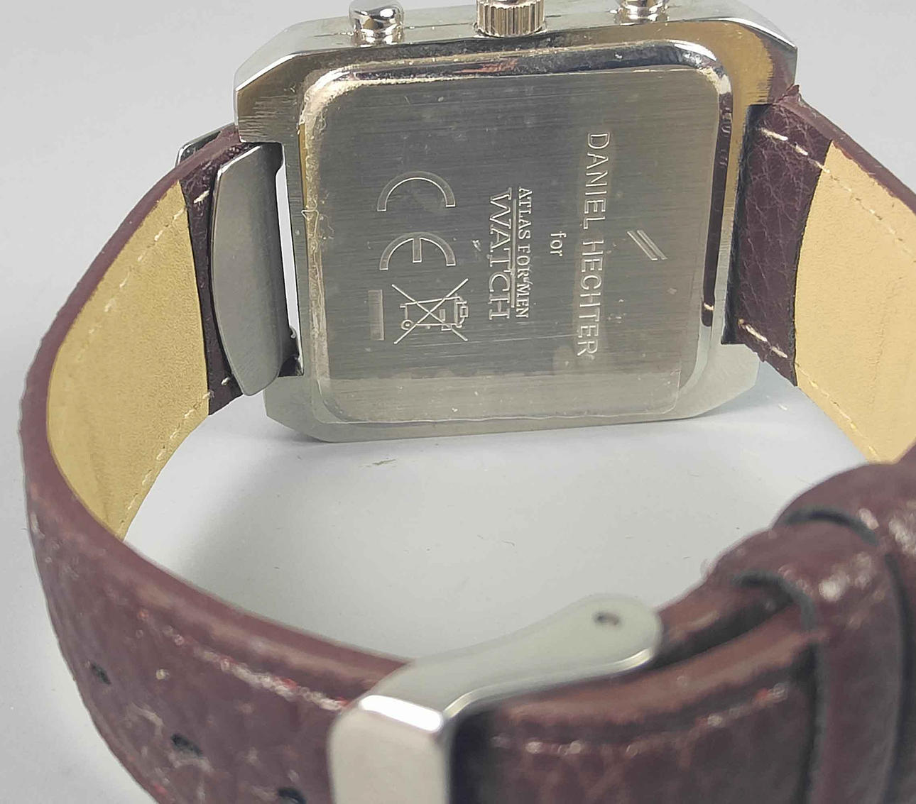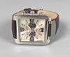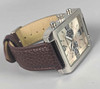 rechteckiges verchromtes Gehäuse, braunes Lederarmband, Zentralsekunde, 36x43mm, neuwertig.